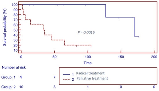 Kaplan–Meier overall survival (OS) curves stratified by treatment intent. The figure shows OS in patients treated with curative intent (Group 1) versus those who received palliative therapy (Group 2). The number of patients at risk at specific time intervals is displayed below the x-axis. Survival curves were compared using the log-rank test.