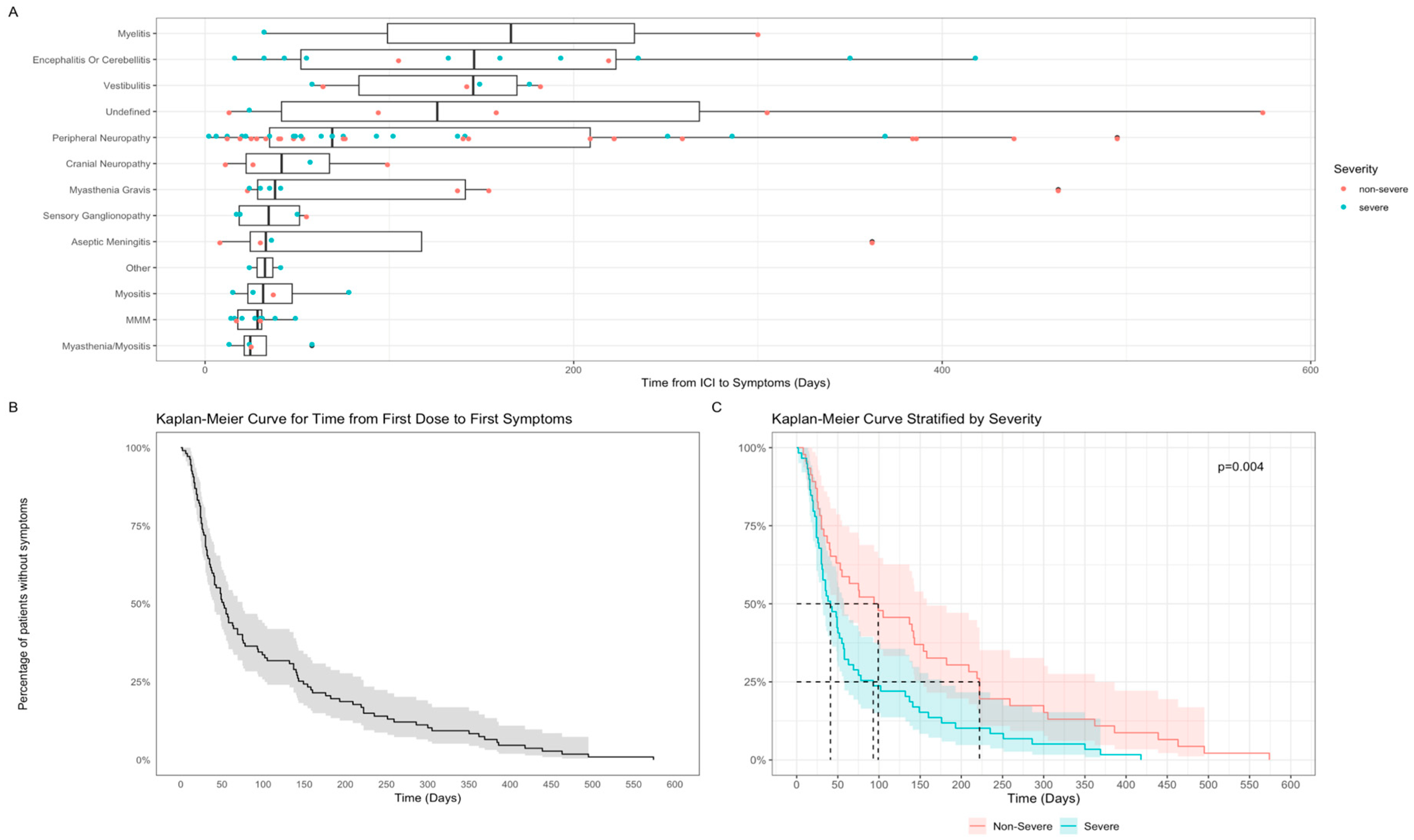 Time from first ICI exposure to symptom onset varied. Overall, median time to N-irAE from first dose was 52 days (range: 2–574). The fastest onset was myasthenia gravis and myositis with a median time of 24.5 days (range: 13–58) and the longest being myelitis with a median time of 166 days (range: 32–300) (Figure 2A). Time to first symptoms differed by N-irAE severity; high grade (CTCAE grade ≥ 3) presentations occurred with median onset of 41 days (n = 61, range 2–418) compared to low grade (CTCAE ≤ 2) (n = 47, median 94 days, 8–574) (p = 0.004, q = 0.007) (Figure 2B,C).