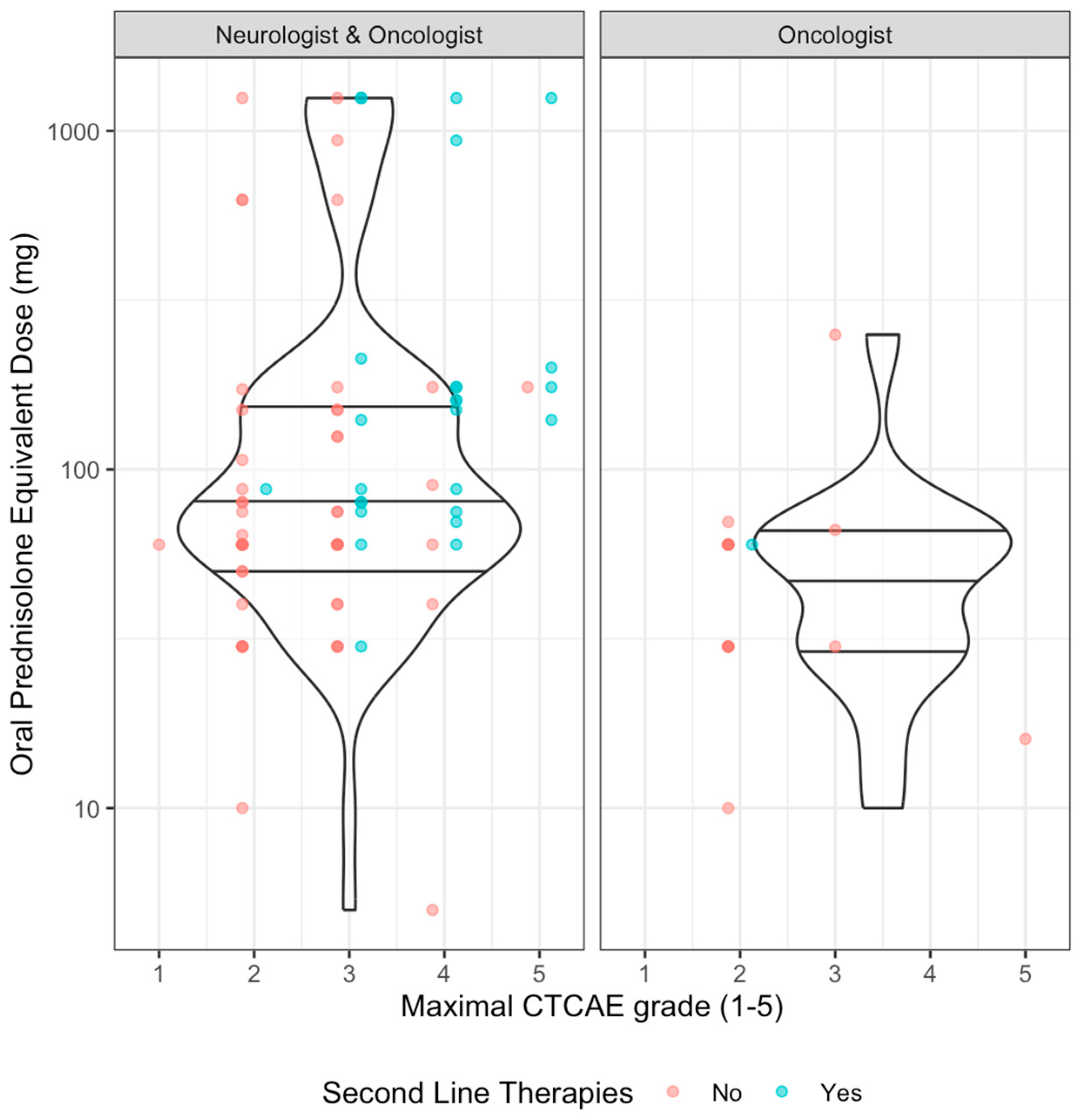 Table 3. N-irAE management (IVIg/PLEX/SSA/Biologic) by grade of toxicity and Neurologist’s involvement. Steroid dose = valid dose (n)/total n with steroids at that grade, med (range).