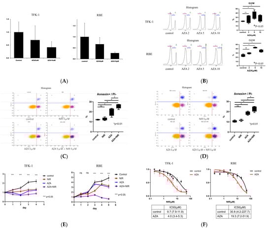 Compared with either NIR or AZA monotherapy, the AZA + NIR treatment increased the proportion of apoptotic cells in TFK-1 and RBE cells.