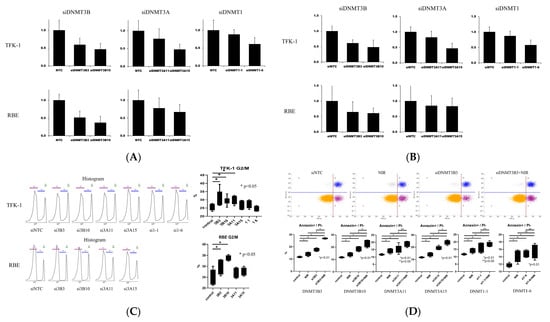 BTC cells were seeded at 1.0 × 106 cells/35 mm. After incubation, the medium lacking 1% penicillin–streptomycin was replaced. A transfection mixture containing 9 µL of Lipofectamine™ RNAiMAX Reagent and 3 µL of 10-µM siRNA targeting DNMT genes was prepared in 150-µL Opti-MEM™ Reduced Serum Medium (Thermo Fisher Scientific). After 5 min, the mixture was sdded dropwise at room temperature. Knockdown efficiency for each target DNMT gene was confirmed via qPCR.