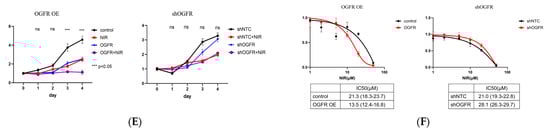 To assess the impact of OGFR expression on NIR sensitivity in TFK-1 cells, dose–response analyses were conducted and IC50 values were calculated. OGFR overexpression reduced the IC50 of NIR, indicating enhanced drug sensitivity, whereas OGFR knockdown increased the IC50, suggesting relative resistance. These results indicate that OGFR expression modulates cellular responsiveness to NIR (Figure 4F).