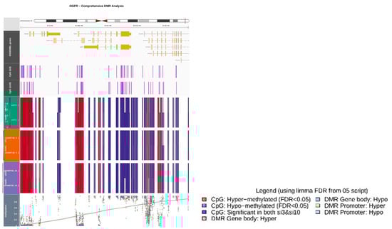 Based on the DMC/DMR profiles, DEG analysis was conducted using the edgeR package (Version 3.26.8) [20,23]. Read counts derived from DMC/DMRs were normalized using the TMM method, and the log2FC values were calculated. Genes exhibiting statistically significant differences in log2FC values between samples were extracted, and multiple testing correction was performed using the Benjamini–Hochberg method to calculate the FDR [23].