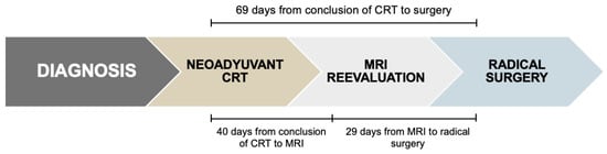 The median interval from completion of neoadjuvant chemoradiotherapy and restaging MRI was 40 days (range: 8–96). The median time between MRI and radical surgery was 29 days (range: 2–124), resulting in a total median interval of 69 days (range: 32–163) from completion of CRT to surgery (Figure 1).