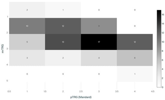 To further assess ordinal correlation between the two grading systems, we calculated Spearman’s rank correlation coefficient and Kendall’s τ-b. Spearman’s ρ was 0.413 (p < 0.001), and Kendall’s τ-b was 0.367 (p < 0.001), confirming a modest positive association between mrTRG and pTRG.