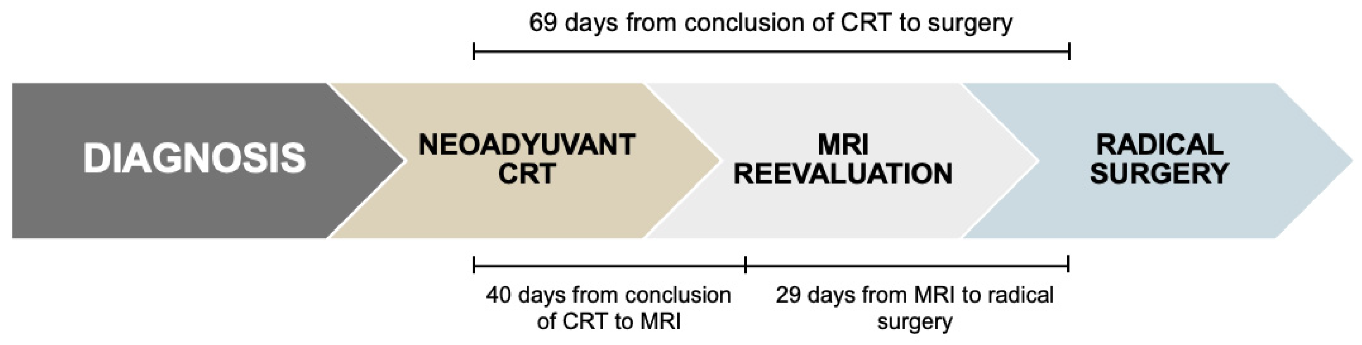 3.2. Time Intervals Between Neoadjuvant Chemoradiotherapy, Restaging MRI and Surgery