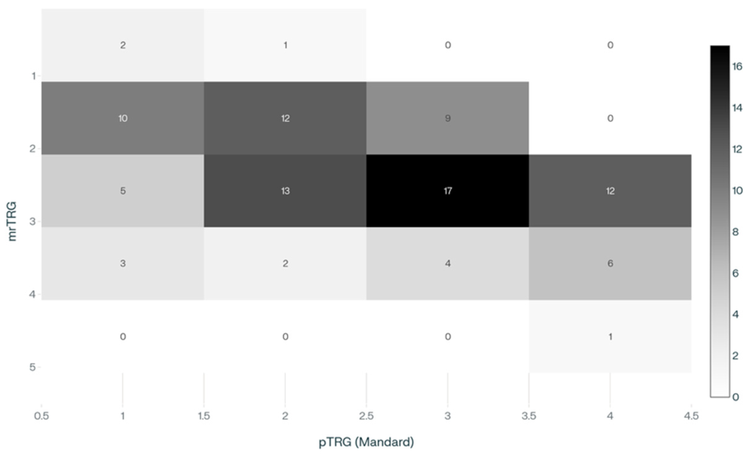 The main objective of this study is to evaluate the correlation between mrTRG and pTGR. To achieve this, we calculated the kappa value and the weighted Kappa test.