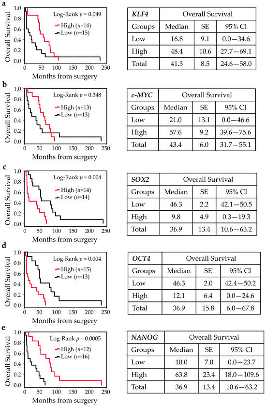 Kaplan–Meier survival curves for ITAC stratified into two groups according to the median value for KLF4, c-MYC, SOX2, OCT4, and NANOG expressions. Low and high expressions of KLF4 (a), c-MYC (b), SOX2 (c), OCT4 (d), and NANOG (e) were associated with overall survival (OS). Comparisons between groups were made using log-rank test, and two-sided p < 0.05 was considered statistically significant. Median values, standard error (SE), and a 95% confidence interval (CI) [minimum–maximum] are summarized in the chart on the right.