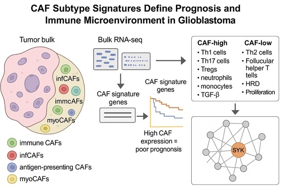 Chicago/Turabian StyleSung, Ji-Yong, and Kihwan Hwang. 2025. "Dissecting CAF Heterogeneity in Glioblastoma Reveals Prognostic Subtypes and a Central Regulatory Role for Spleen Tyrosine Kinase (SYK)" Cancers 17, no. 24: 3942. https://doi.org/10.3390/cancers17243942