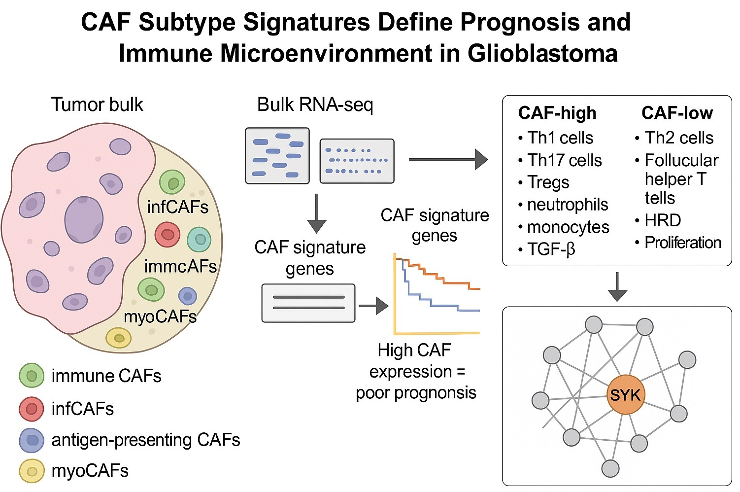 Sung, J.-Y.; Hwang, K. Dissecting CAF Heterogeneity in Glioblastoma Reveals Prognostic Subtypes and a Central Regulatory Role for Spleen Tyrosine Kinase (SYK). Cancers 2025, 17, 3942. https://doi.org/10.3390/cancers17243942
