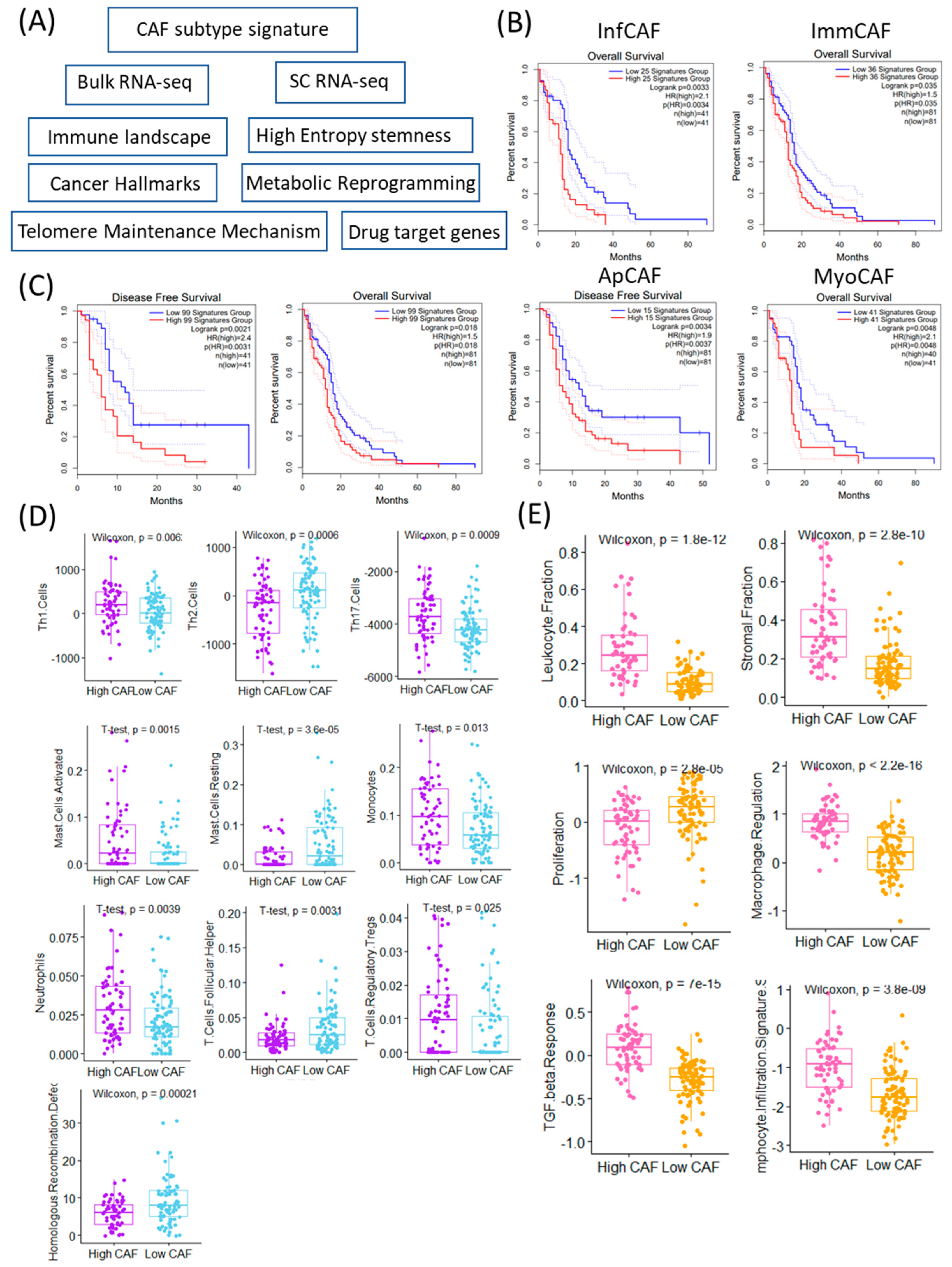 Figure 1. Clinical and immunological significance of CAF (Cancer-Associated Fibroblast) signature stratification. (A) Schematic overview of the study workflow identifying and analyzing CAF-related signatures in cancer samples. (B) Kaplan–Meier survival curves comparing overall survival (OS) and (C) disease-free survival (DFS) between patients stratified into high vs. low CAF signature groups across TCGA GBM. Log-rank p-values and sample sizes are indicated in each panel. (D) Boxplots showing significantly different immune cell infiltration (Th1, Th2, Th17 cells) between high and low CAF groups (Wilcoxon test). Differences in leukocyte and stromal fractions between high and low CAF groups, based on immune deconvolution (Wilcoxon test). Boxplots showing significant differences in immune cell subtypes (activated/resting mast cells and monocytes) based on CAF signature levels (t-test). Neutrophils, T-cell follicular helper, and regulatory T-cell proportions differ significantly between high and low CAF signature groups (t-test). (E) Functional signature scores (proliferation, macrophage regulation, TGF-beta response, lymphocyte infiltration) differ significantly between high and low CAF groups (Wilcoxon test). Homologous recombination defect scores are significantly higher in the high CAF group (Wilcoxon test).