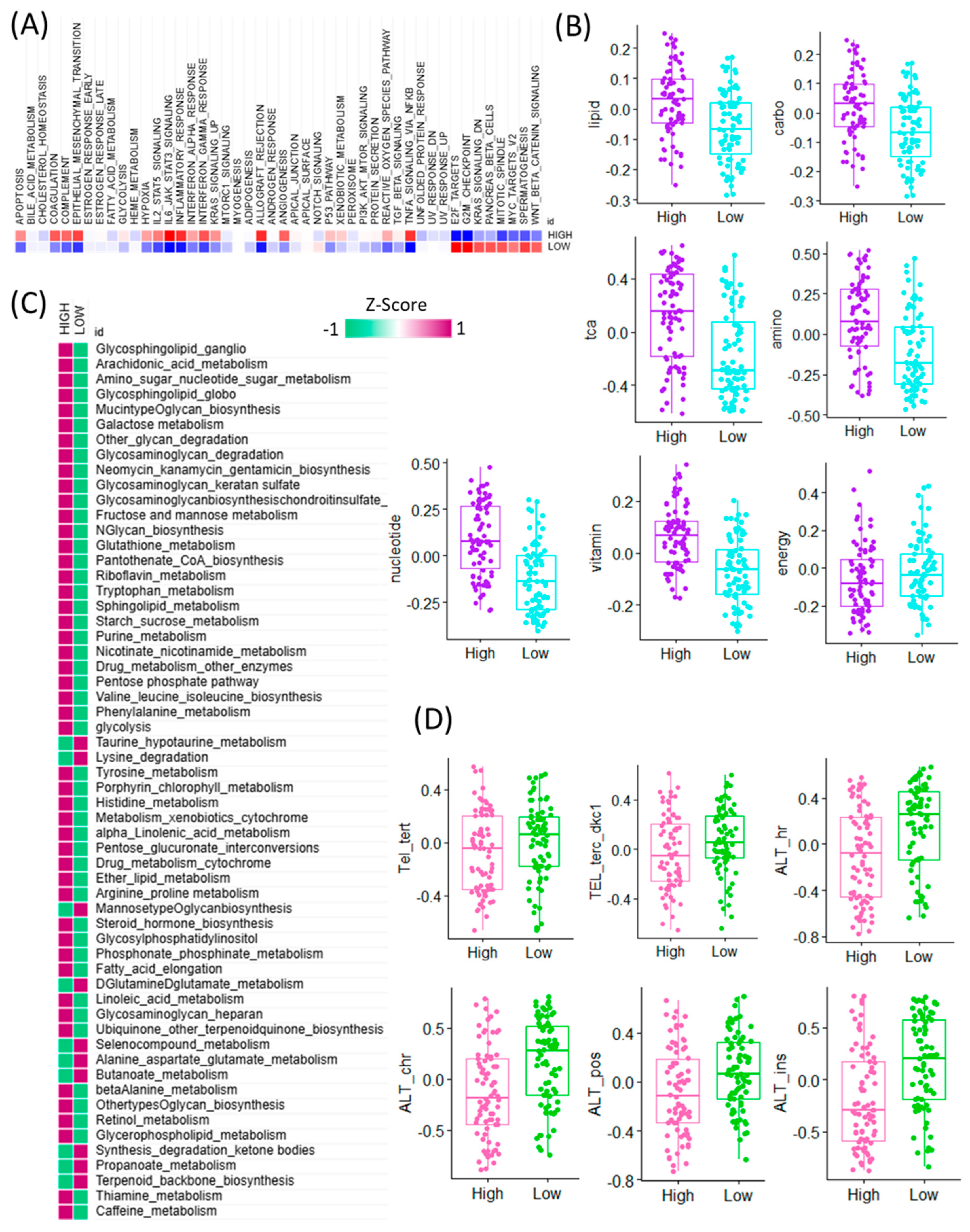 Metabolic pathway profiling utilized seven major KEGG categories (lipid, carbohydrate, TCA cycle, amino acid, nucleotide, vitamin, energy metabolism). Pathway scores were normalized and centered before comparison. Telomere maintenance mechanisms (TMM), including ALT-related modules, were evaluated using previously published ALT gene sets.