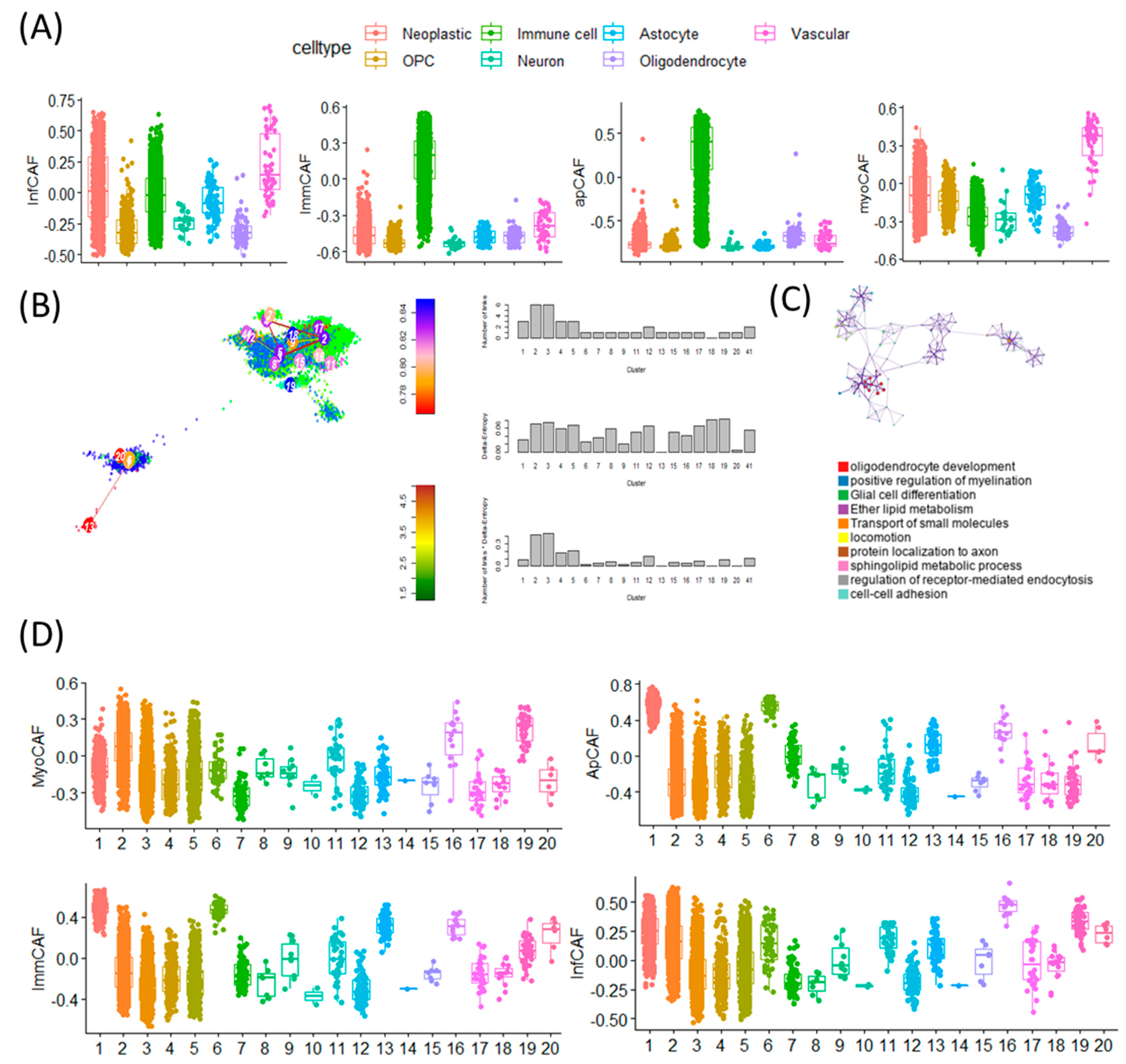 Figure 3. Single-cell transcriptomic analysis reveals distinct CAF subtype activities, stemness gradients, and pathway enrichments across GBM cellular states. (A) Boxplots showing abundance scores of four CAF subtypes—inflammatory CAF (iCAF), immunomodulatory CAF (imCAF), antigen-presenting CAF (apCAF), and myofibroblastic CAF (myCAF)—across seven major GBM single-cell types. Each color represents a distinct cell population: Neoplastic (red), OPC-like (yellow), Immune cells (green), Neuron-like (cyan), Astrocytes (pink), Oligodendrocytes (purple), Vascular cells (magenta) These plots illustrate the differential activation of CAF subtype transcriptional programs across diverse cellular compartments of the GBM microenvironment. (B) t-SNE map of GBM single cells generated using the StemID algorithm. Cells are colored by StemID-defined cluster number, with clusters labeled directly on the plot. Arrows indicate inferred lineage trajectories. StemID derives stemness based on transcriptional entropy, shown on the accompanying entropy scale bar: higher entropy = higher transcriptional plasticity and stem-like potential. Bar plots to the right summarize entropy values across the 20 clusters. (C) Biological pathways enriched in high-entropy clusters-representing transcriptionally plastic, stem-like glioblastoma cell states. The pathway enrichment map and network highlight dominant programs characteristic of these clusters, including Oligodendrocyte development, Positive regulation of myelination, Glial cell differentiation, Ether lipid metabolism, Transport of small molecules, Locomotion and migration, Protein localization to axon, Sphingolipid metabolic process, Regulation of receptor-mediated endocytosis, Cell–cell adhesion. These pathways collectively demonstrate that high-entropy clusters engage developmental, metabolic, and invasive programs, consistent with GBM stem-like phenotypes. (D) Boxplots showing the distribution of CAF subtype scores (myCAF, apCAF, imCAF, iCAF) across the 20 StemID transcriptional clusters. Distinct score patterns across clusters highlight significant heterogeneity in CAF program activation among GBM cellular states.