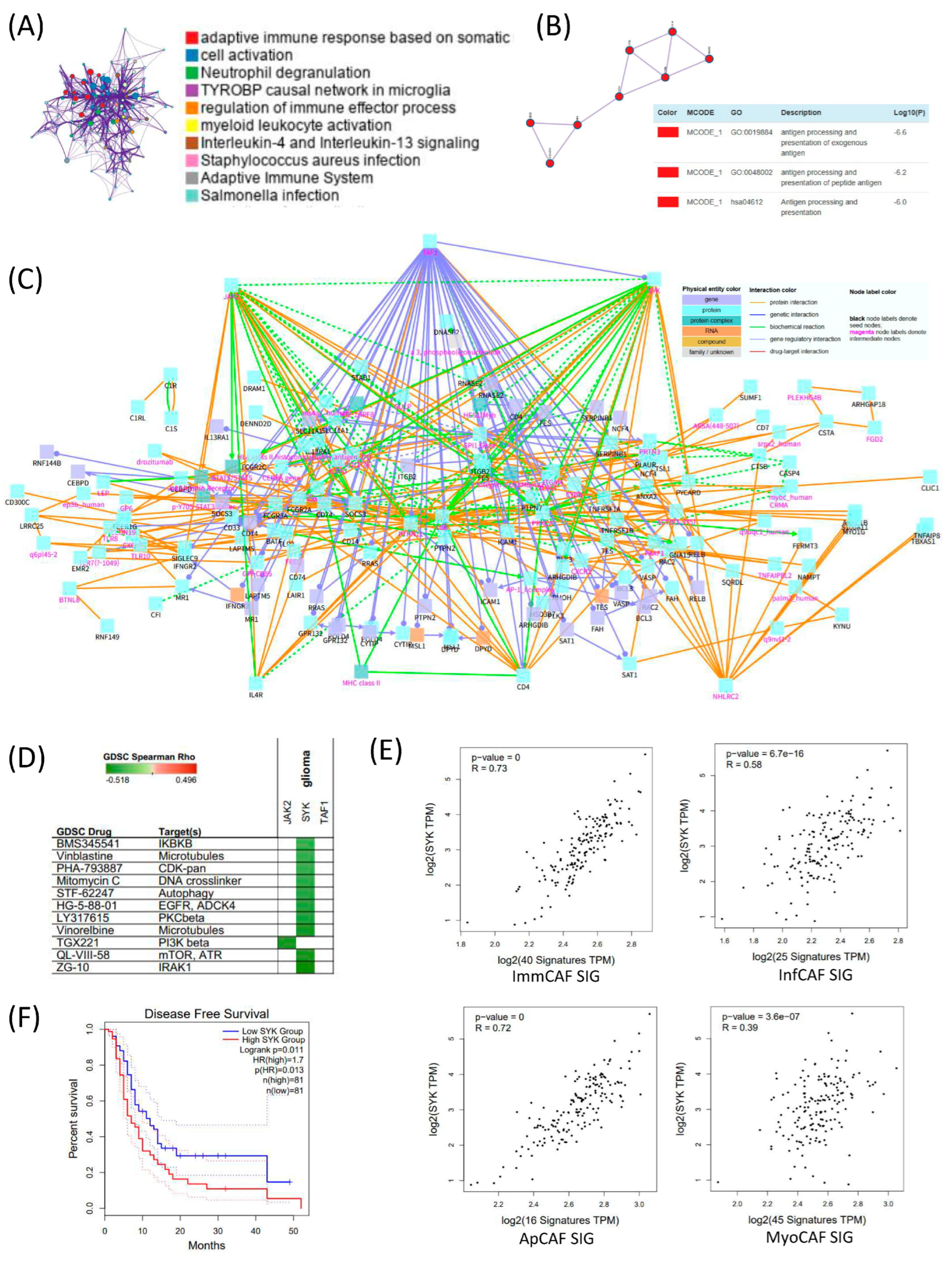 Figure 4. Integrated analysis of CAF-associated immune regulation and SYK-mediated prognostic significance in TCGA GBM. (A) Differentially expressed genes (DEGs) between high and low cancer-associated fibroblast (CAF) groups in TCGA GBM dataset were identified and subjected to pathway enrichment analysis. Prominent immune-related pathways are highlighted. (B) Protein–protein interaction (PPI) network of DEGs constructed using MCODE clustering, with major clusters annotated by Gene Ontology (GO) terms related to antigen processing and presentation. (C) Functional network of the high-CAF group constructed using ConsensusPathDB (CPDB). Genes and pathways are visualized with physical entity and interaction types annotated. Notably, immune cell signaling, cytokine response, and antigen presentation modules are enriched. (D) Drug response correlation analysis using Genomics of Drug Sensitivity in Cancer (GDSC) dataset. SYK expression shows significant correlation with sensitivity to several targeted agents, particularly those affecting microtubules, DNA replication, and kinase signaling. (E) Correlation analysis between SYK expression and four CAF subtype signature gene sets. SYK expression is significantly positively correlated with all CAF subtype signatures, indicating its potential regulatory role. (F) Kaplan–Meier disease-free survival analysis based on SYK expression levels. Patients with high SYK expression (red) exhibit significantly shorter survival compared to those with low SYK expression (blue), highlighting its prognostic relevance in GBM.