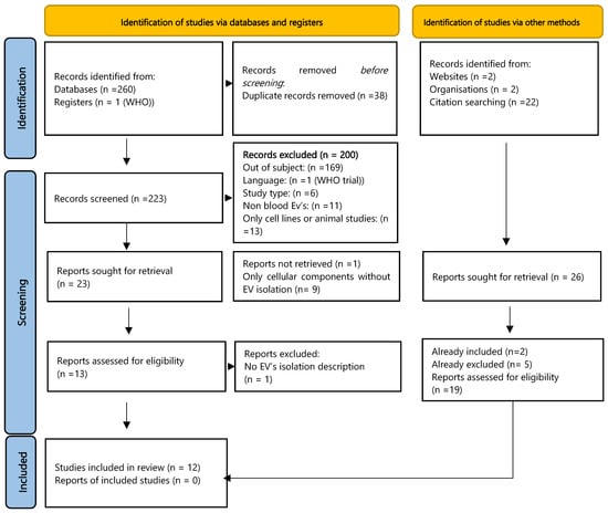 The electronic search across four databases yielded 260 records, with one additional record identified from clinical trial registry platforms. Following the removal of duplicates via EndNote (n = 27) and manual screening (n = 11), 223 unique records remained. After screening titles and abstracts, 23 studies were retained for full-text assessment. Subsequently, 12 studies met the eligibility criteria and were included in the qualitative analysis. (Figure 1).