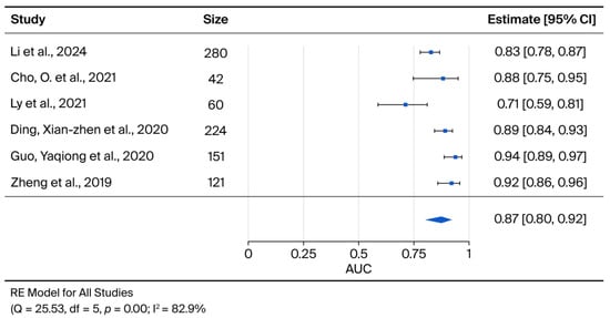 The meta-analysis of the six studies meeting the eligibility criteria yielded a pooled AUC of 0.87 (95% CI: 0.80, 0.92), indicating robust diagnostic accuracy for exosomes as potential biomarkers for cervical cancer (Figure 2).