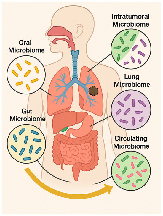 Emerging evidence further highlights that distinct microbial niches, including the oral cavity, gut, lungs, and intratumoral and circulating microbiome, contribute to LC pathogenesis and therapy responses [15]. The oral microbiome serves as a microbial reservoir, seeding the lower airways and influencing local inflammation [16]. Dysbiosis, characterized by the overgrowth of pathogens such as Fusobacterium nucleatum, Porphyromonas gingivalis, and Prevotella species, promotes chronic inflammation and facilitates the translocation of bacteria or their metabolites to the lower respiratory tract via micro-aspiration. Once in the lung microenvironment, these microbes modulate epithelial signaling, enhance immune evasion, and activate tumor-promoting pathways such as NF-κB, signal transducer and activator of transcription 3 (STAT3), and β-catenin [16]. Bacterial virulence factors contribute to DNA damage, impaired apoptosis, and remodeling of the TME, creating conditions favorable for malignant transformation [17]. The gut microbiota modulates systemic immunity and controls antitumor responses, particularly in the context of immune checkpoint blockade. The lung microbiome directly affects epithelial homeostasis and the immune tone, while intratumoral microbes influence the TME by modulating cytokine production, angiogenesis, and immune cell infiltration [3]. Additionally, circulating microbial DNA and EVs reflect microbial translocation and may serve as non-invasive biomarkers or mediators of distant immune modulation [18] (Figure 1).
