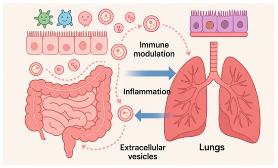 Schematic diagram of bEVs as molecular bridges in the gut–lung axis. Environmental and microbial factors determine the bEV cargo, influencing immune regulation, inflammation, and tumor progression. Microsoft Copilot was used for the graphical rendering of the figure.