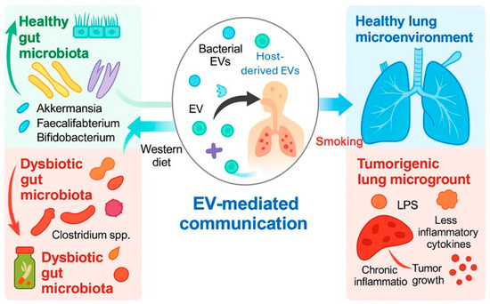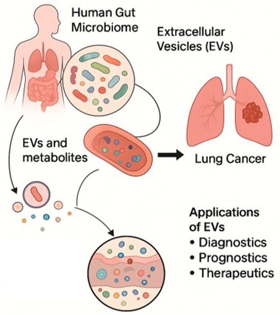 In recent years, the discovery of a distinct and dynamic microbial community within the lungs has fundamentally transformed the understanding of respiratory health and disease. Once considered sterile, currently lungs are known to harbor a low-biomass but immunologically active microbiota that interacts with host pathways, modulates inflammatory responses, and potentially contributes to tumor biology [1,2]. In parallel, the gastrointestinal (GI) tract, which hosts the most various and densely populated microbiota in the human body, serves as a critical regulator of systemic immunity. Bidirectional communication between the gut and lung mucosa, termed the gut–lung axis, plays a pivotal role in modulating immune responses and cancer biology [3,4]. Microbial metabolites, immune cell trafficking, and epigenetic regulators disseminate signals systemically, influencing the lung tumor microenvironment (TME) and therapeutic responses. Lung cancer (LC), predominantly non-small cell lung cancer (NSCLC), remains the leading cause of cancer-related mortality worldwide. Although treatments such as immune checkpoint inhibitors (ICIs) have improved outcomes, resistance and variable clinical responses persist, highlighting the need to better understand how the gut–lung axis affects tumor immunity and progression. Among the mediators of inter-organ communication, extracellular vesicles (EVs) secreted by host and microbial cells have emerged as key players, carrying bioactive cargos that regulate immune modulation and tumor progression [5,6]. EVs are membrane-bound nanoparticles released by all cell types, and they are essential for intercellular communication [7]. Recent guidelines from the International Society for Extracellular Vesicles (ISEV) have standardized their isolation and characterization, supporting clinical translation [8]. Host-derived EVs hold promise for early diagnosis, disease monitoring, and revealing tumor heterogeneity, drug resistance, and disease progression [9,10]. The bEVs released from prokaryotic membranes carry unique cargos such as lipopolysaccharides (LPSs), peptidoglycans, bacterial metabolites, and virulence factors. These components enable bEVs to interact with host epithelial and immune cells through pathways distinct from those activated by host EVs, often eliciting strong pro-inflammatory responses, modulating innate immunity, and influencing oncogenic signaling [11]. bEVs can disseminate systemically and reach distal organs, including the lungs, independently of viable bacteria, acting as potent mediators of microbe–host communication [12]. These mechanistic specificities provide a compelling rationale for examining bEVs as contributors to lung carcinogenesis. Recent evidence indicates that bEVs are drivers of cancer progression through multiple complementary mechanisms. bEVs actively remodel the TME by promoting immunosuppression, macrophage M2 polarization, and inhibition of dendritic cell maturation, thereby facilitating tumor immune evasion. They also deliver genetic and epigenetic regulators including DNA, microRNAs (miRNAs), virulence factors, and chromatin-modifying enzymes that modulate oncogene activation, suppress tumor suppressor pathways, and modulate host transcriptional programs. In addition, bEVs promote angiogenesis and metastasis by inducing VEGF expression, transporting matrix metalloproteinases, and triggering the epithelial–mesenchymal transition (EMT). Their cargo, which is enriched in pathogen-associated molecular patterns (PAMPs), activates nuclear factor kappa-light-chain-enhancer of activated B cells (NF-κB) and Mitogen-Activated Protein Kinase (MAPK) signaling pathways, sustaining chronic inflammation, oxidative stress, and DNA damage, all of which contribute to tumor initiation and progression [13,14].