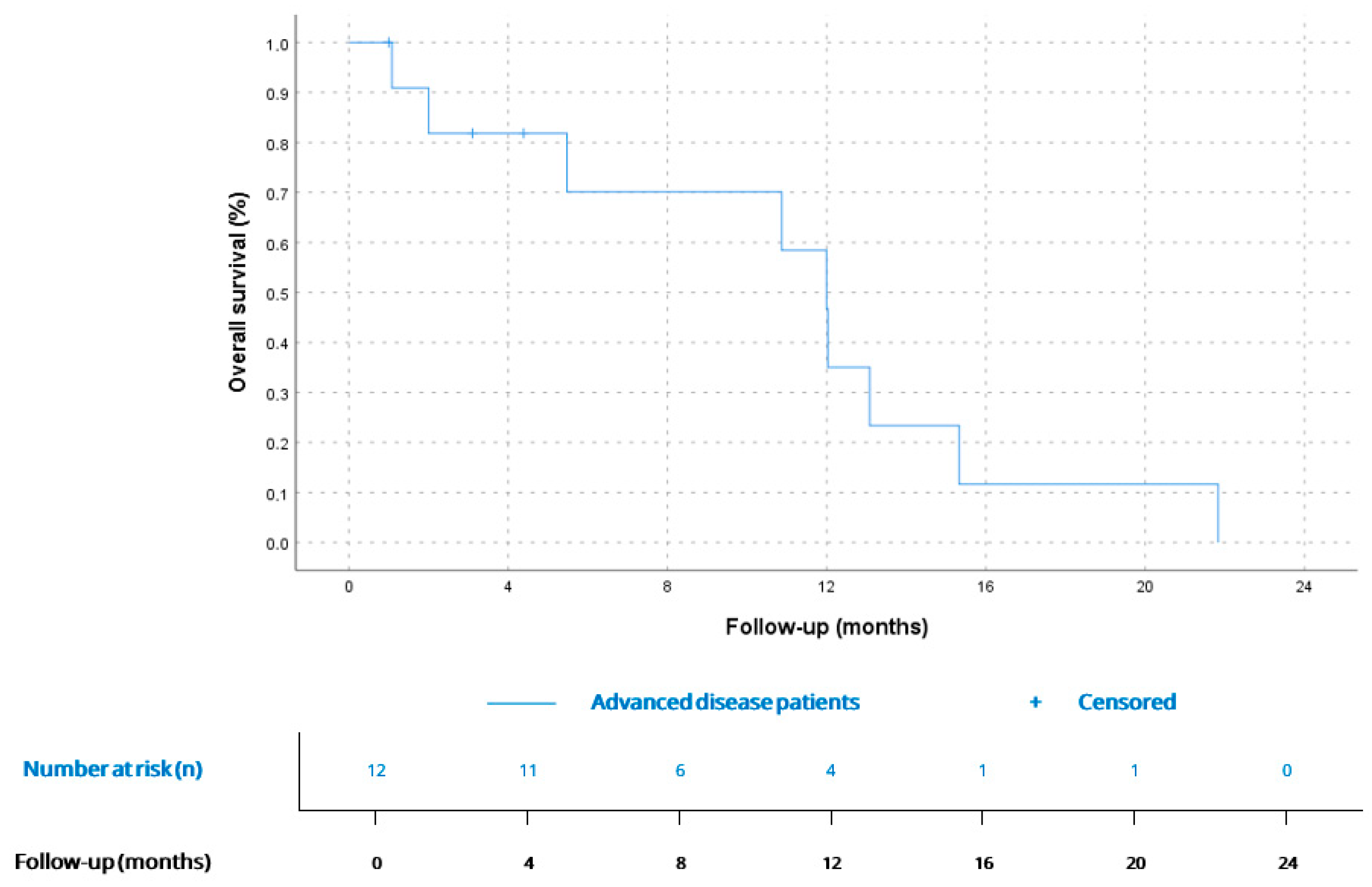 | Advanced disease * (n = 12) | Metastatic disease | 11 (91.6) |