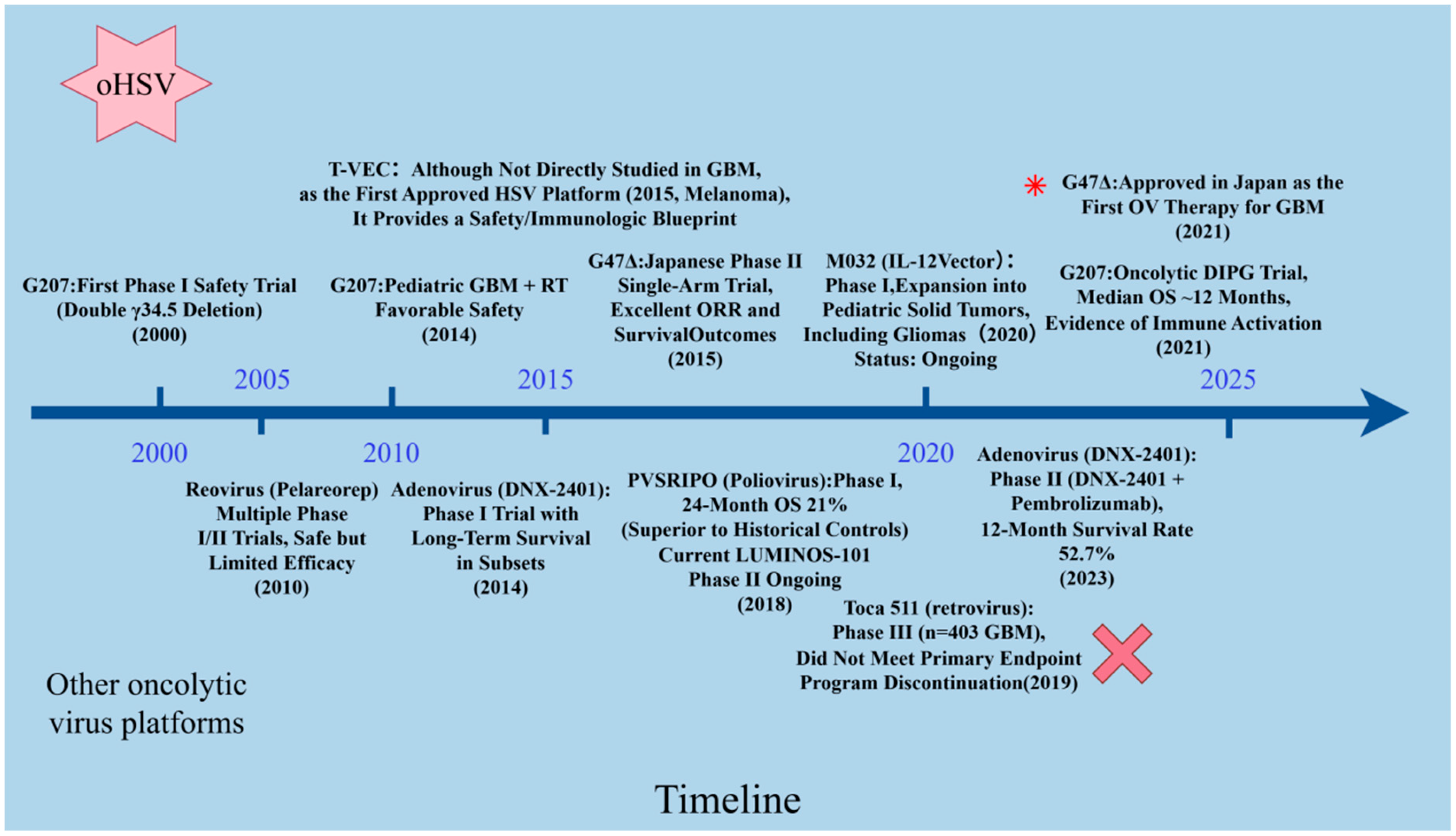 - Yang, R.; Hedberg, J.; Montagano, J.; Seals, M.; Puri, S. Oncolytic Virus Therapies in Malignant Gliomas: Advances and Clinical Trials. Cancers 2025, 17, 3180. [Google Scholar] [CrossRef] [PubMed]