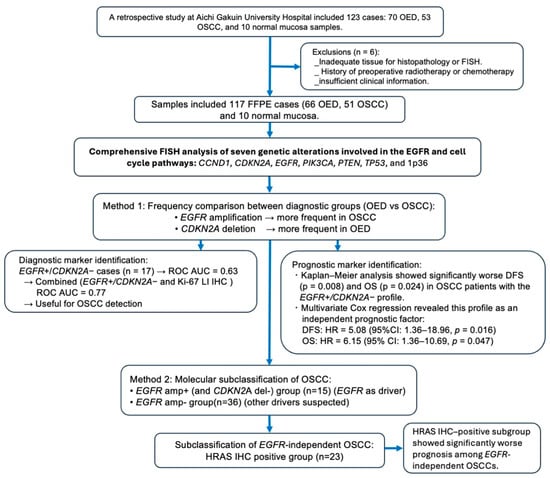 Chicago/Turabian StyleOkubo, Satoshi, Satoru Miyabe, Masahiro Fukumura, Jun Sasaki, Hitoshi Fujii, Fumitaka Terasawa, Satoshi Watanabe, Soma Okada, Megumi Miyabe, Katsuyuki Miyabe, and et al. 2025. "Molecular Characterization of Oral Epithelial Dysplasia and Oral Squamous Cell Carcinoma Using EGFR, CDKN2A, and HRAS Alterations" Cancers 17, no. 24: 3949. https://doi.org/10.3390/cancers17243949