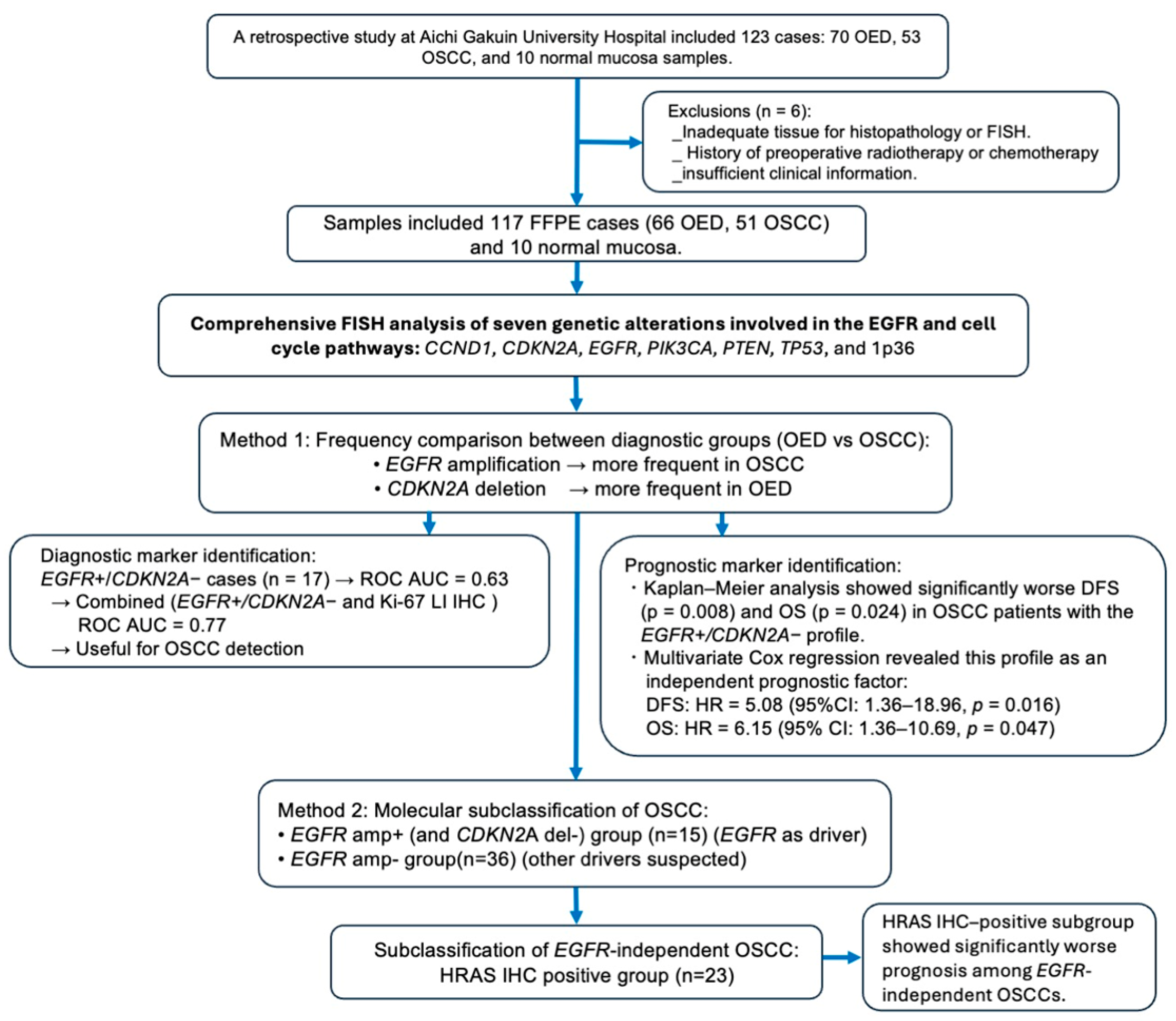 Okubo, S.; Miyabe, S.; Fukumura, M.; Sasaki, J.; Fujii, H.; Terasawa, F.; Watanabe, S.; Okada, S.; Miyabe, M.; Miyabe, K.; et al. Molecular Characterization of Oral Epithelial Dysplasia and Oral Squamous Cell Carcinoma Using EGFR, CDKN2A, and HRAS Alterations. Cancers 2025, 17, 3949. https://doi.org/10.3390/cancers17243949