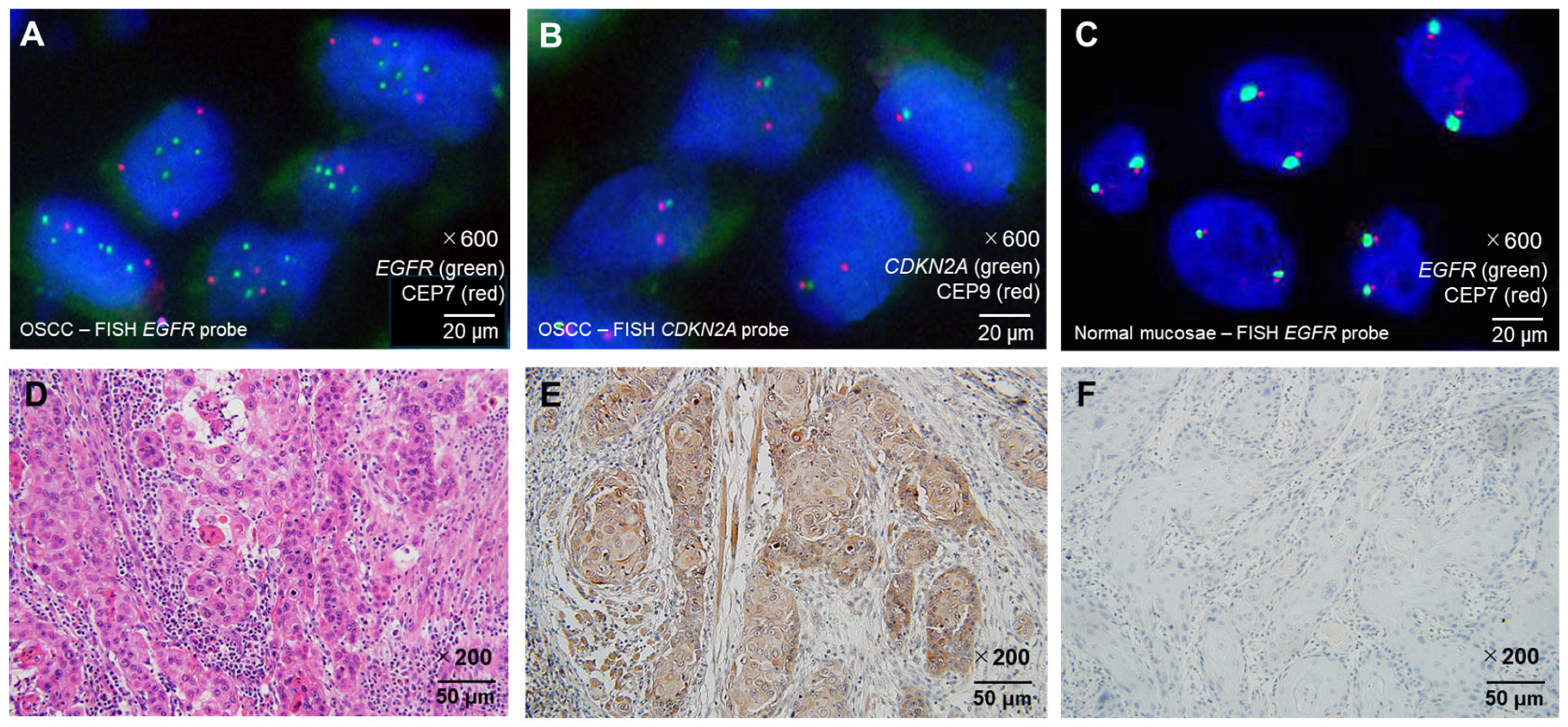 - Huang, S.F.; Cheng, S.D.; Chien, H.T.; Liao, C.T.; Chen, I.H.; Wang, H.M.; Chuang, W.Y.; Wang, C.Y.; Hsieh, L.L. Relationship between epidermal growth factor receptor gene copy number and protein expression in oral cavity squamous cell carcinoma. Oral Oncol. 2012, 48, 67–72. [Google Scholar] [CrossRef]