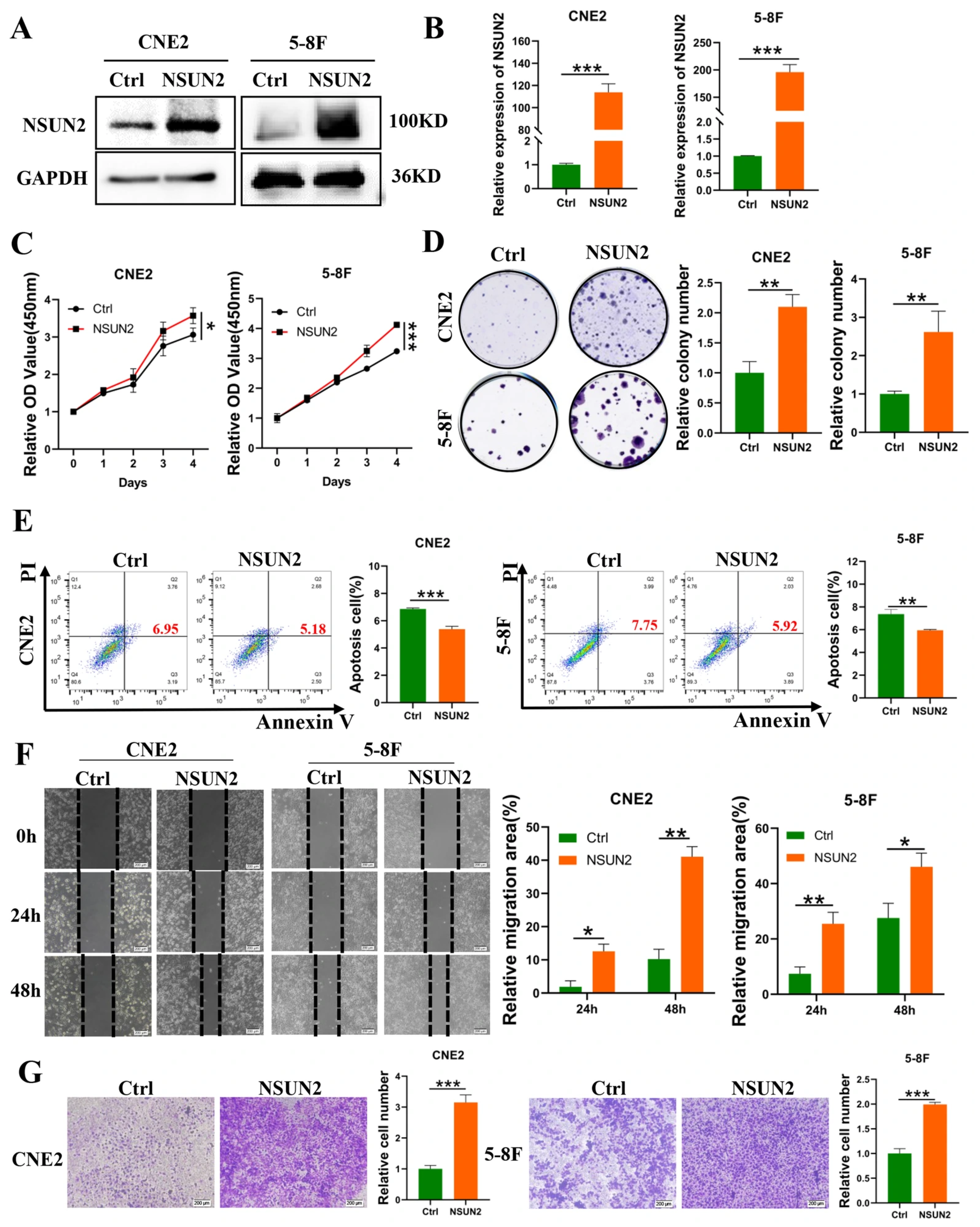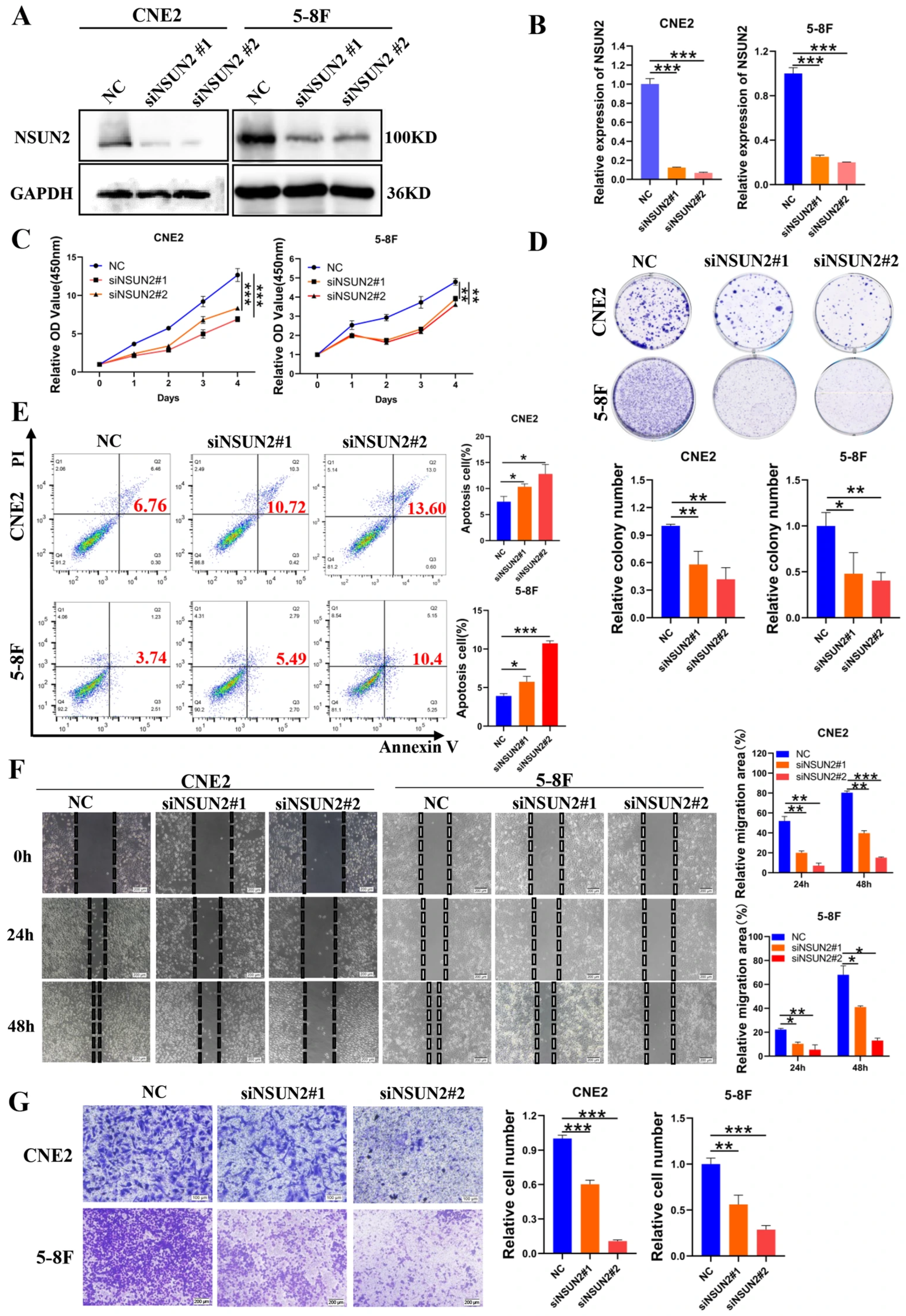 3.2. NSUN2 Promotes Proliferation, Migration, and Invasion, and Reduces NPC Cell Apoptosis