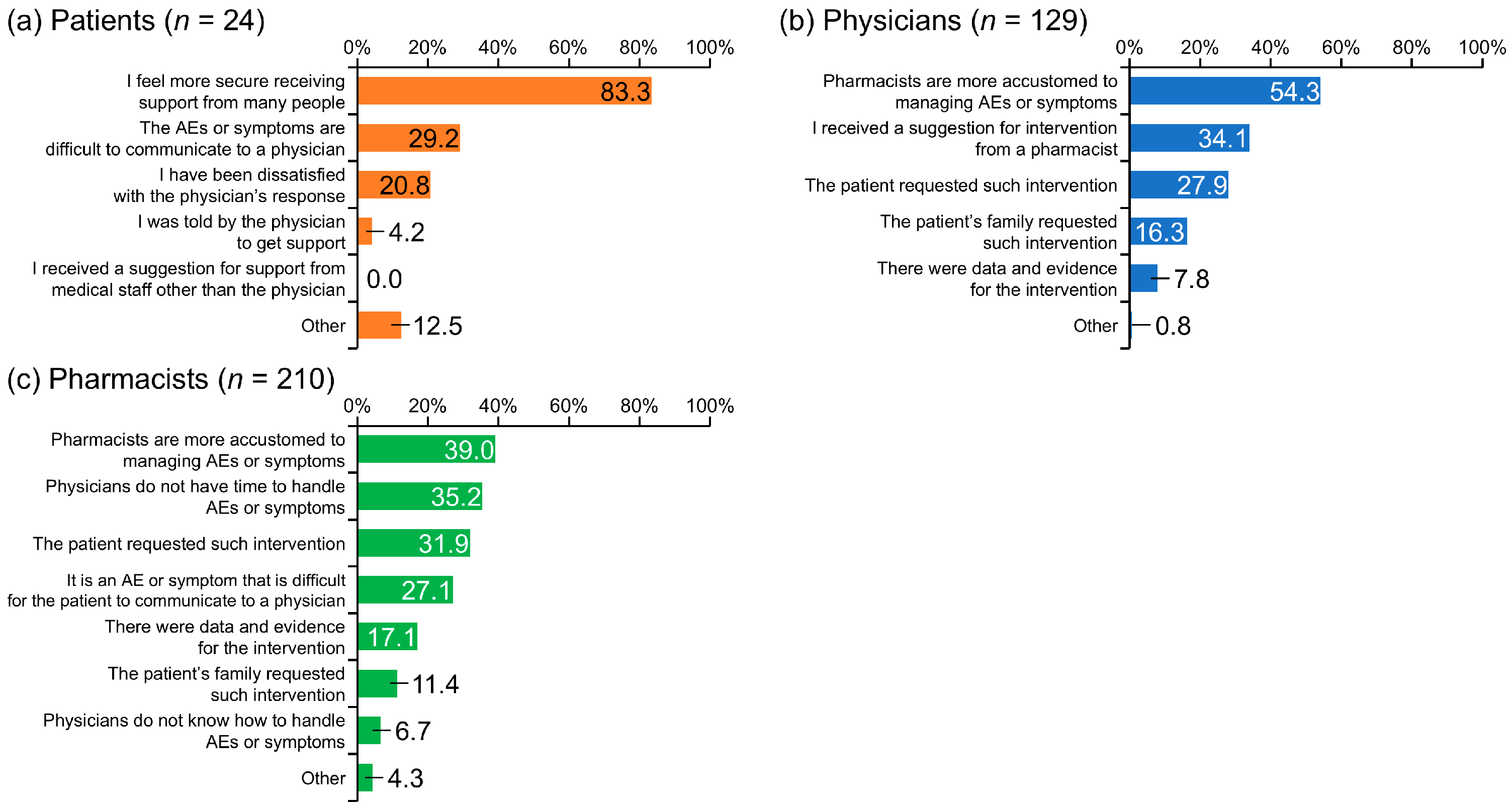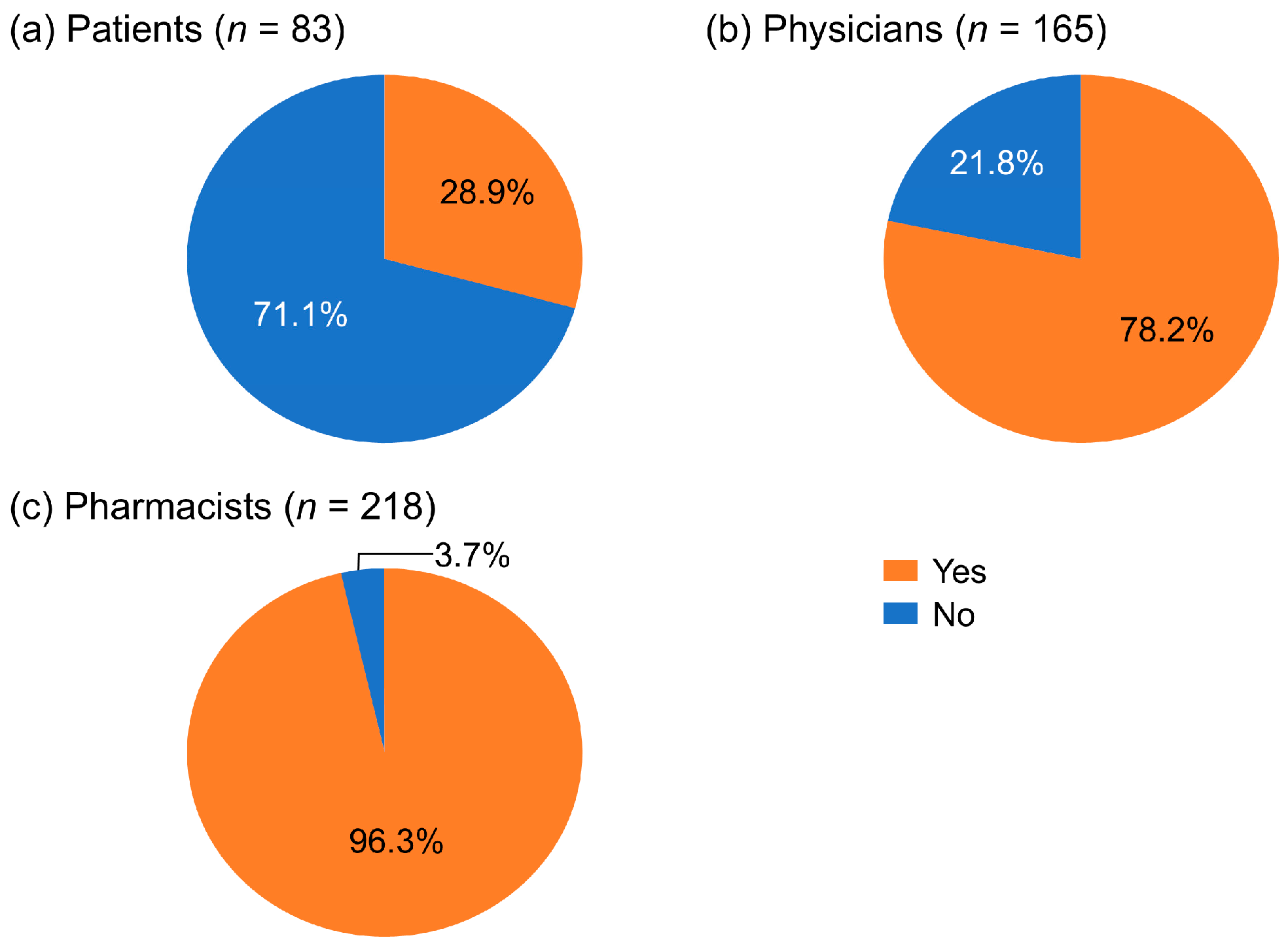 | Characteristic | Patients (n = 83) | Physicians (n = 165) | Pharmacists (n = 218) |