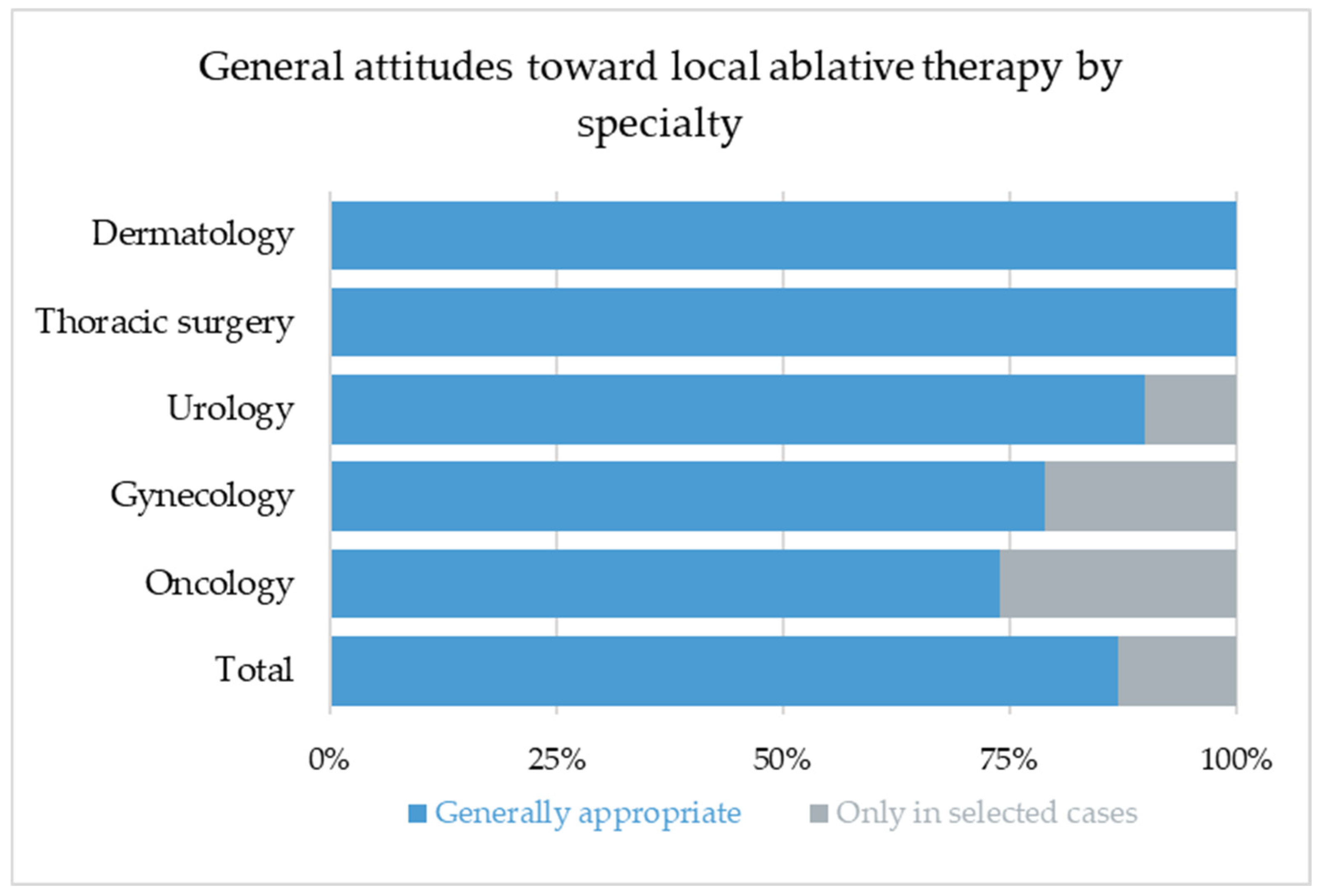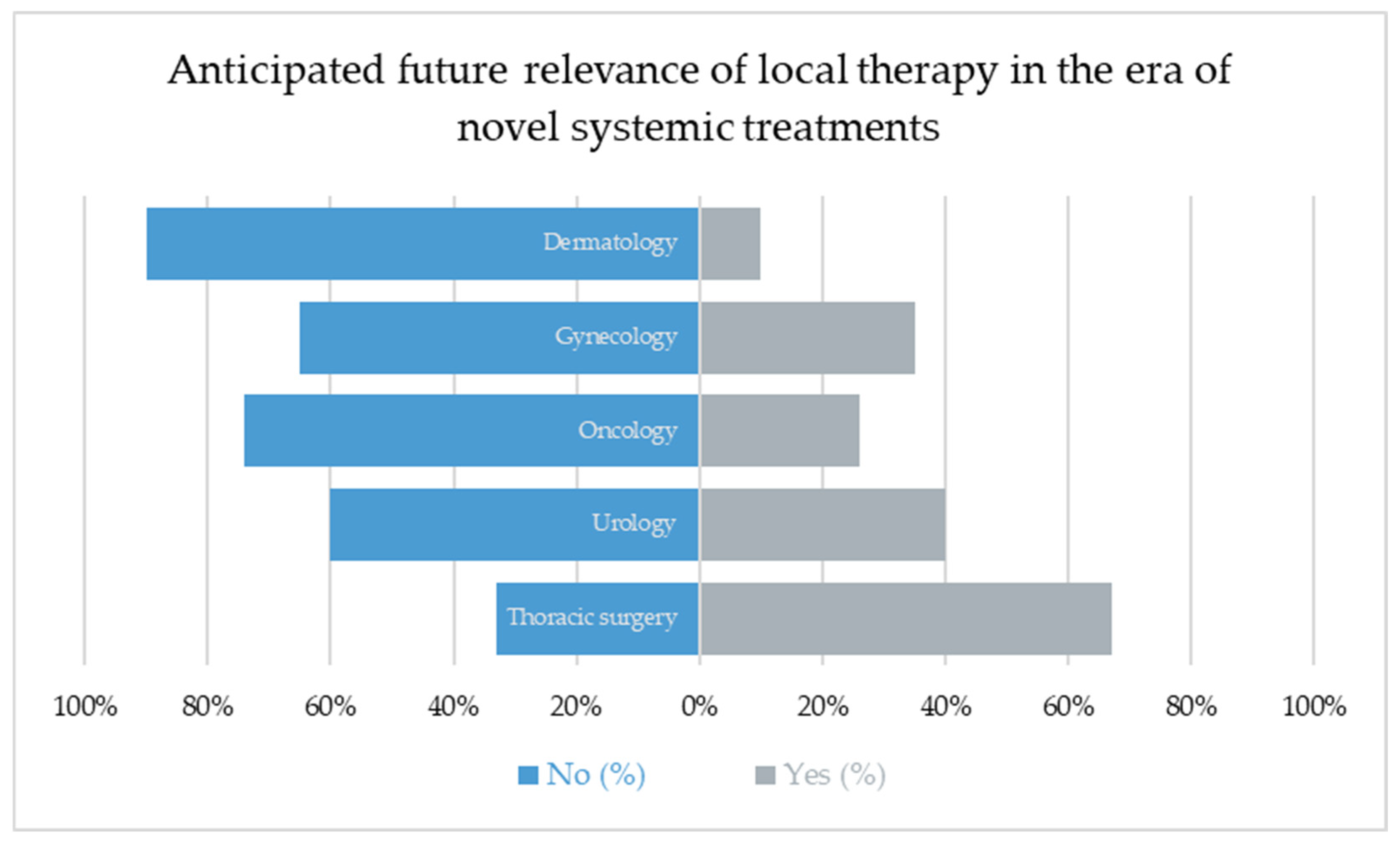 Despite major advances in systemic oncology, including immunotherapy and targeted agents, most respondents did not anticipate the diminishing role of local ablative treatments. Overall, 43% expected a future decrease in importance, while the majority envisioned that local therapies would remain integral to multimodal concepts.