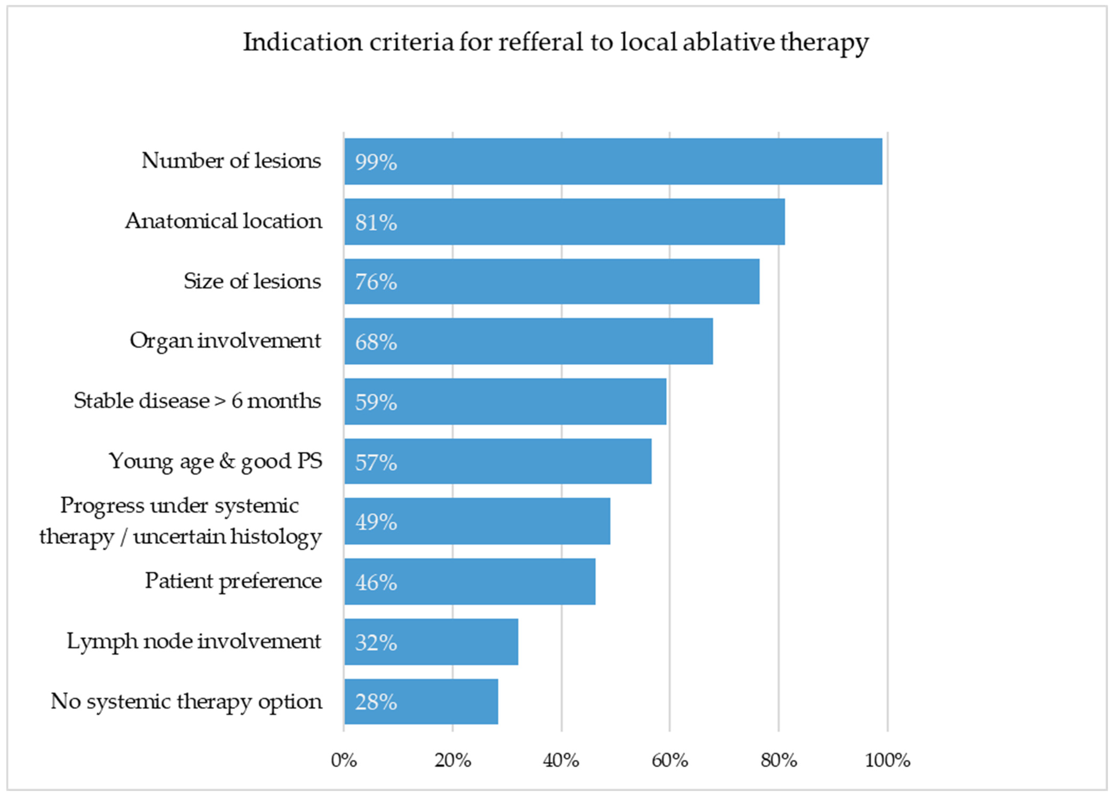 When evaluating factors influencing referral for local ablative treatment of pulmonary metastases, respondents showed both consensus and marked inter-specialty heterogeneity.