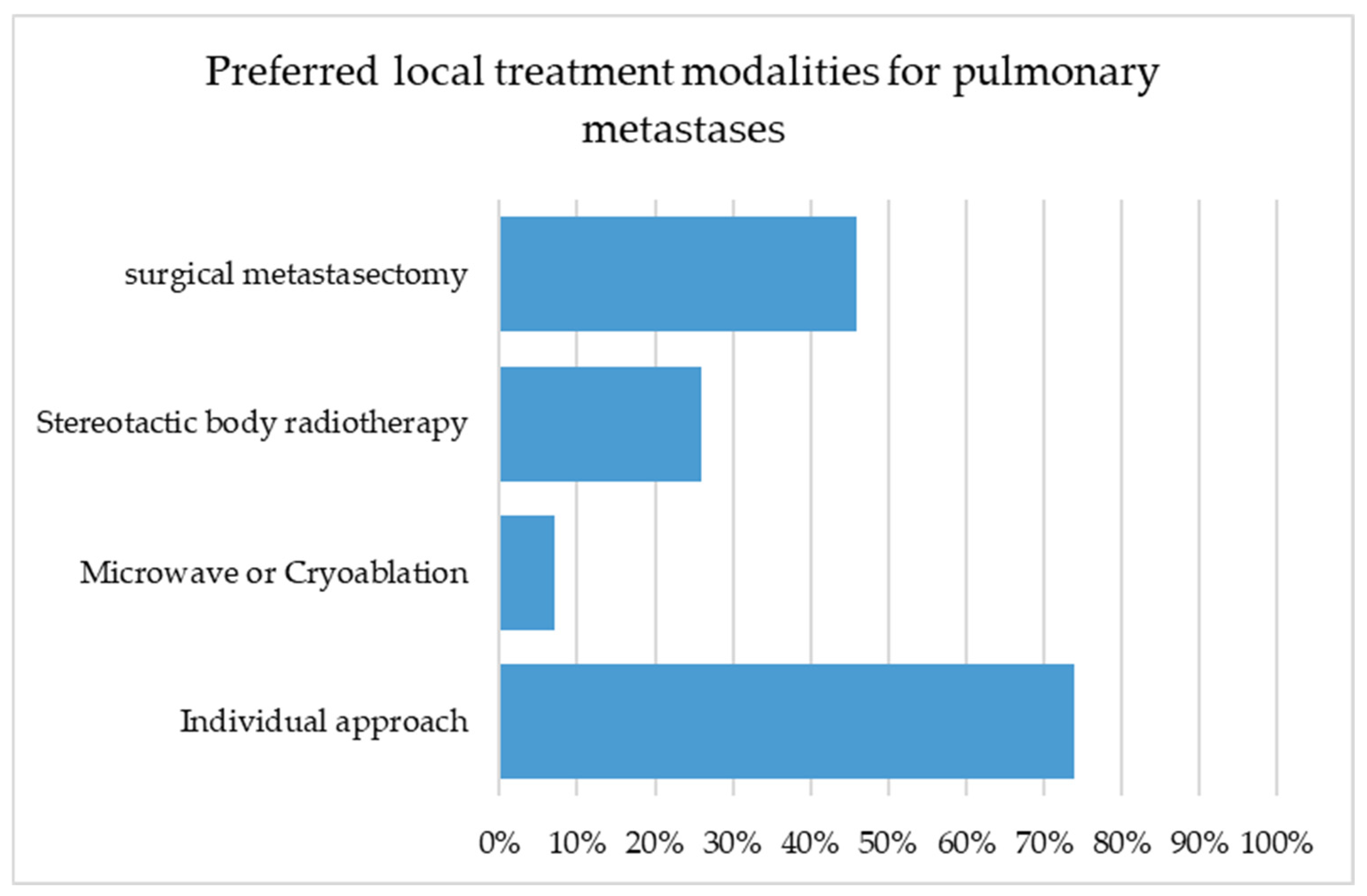 Although all respondents consider local therapy to be an essential component in the management of metastatic disease, only 46% regarded pulmonary metastasectomy as the treatment of choice, while 75% favored an individualized approach and 25% considered SBRT to be the most appropriate modality. It is not surprising that thoracic surgeons and urologists showed the highest preference for surgical resection, as these groups are most frequently involved in surgical treatment of metastases.