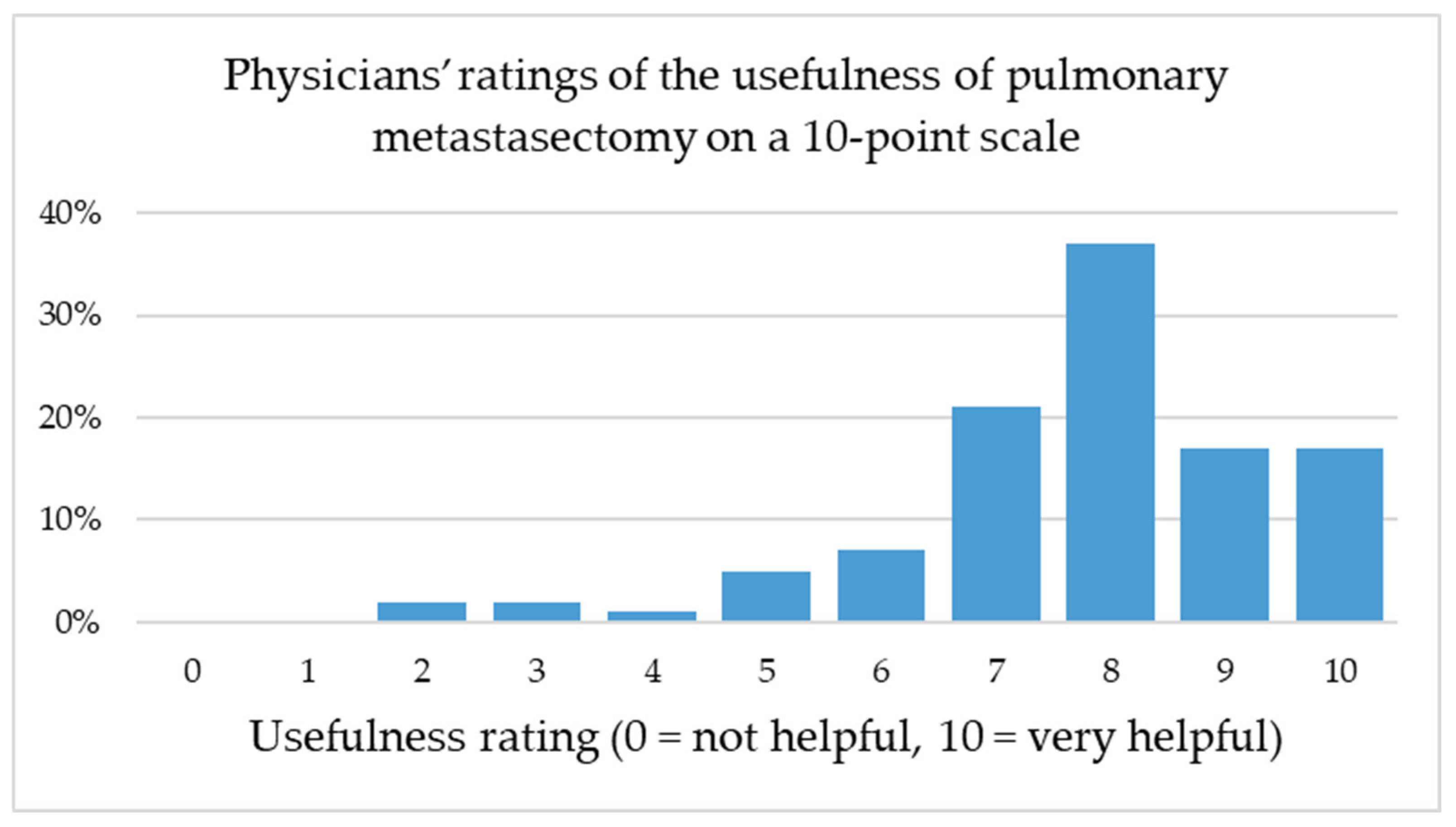 Their views on the disease and its treatment may be different, and the possible answers may lead to more clinically oriented endpoints for future studies. Therefore, we conducted an explorative survey among active oncologists, urologists, gynecologists and dermatologists. By comparing their responses, we aim to identify differences in treatment philosophies, expectations and attitudes towards pulmonary metastasectomy across specialties and geographic regions.