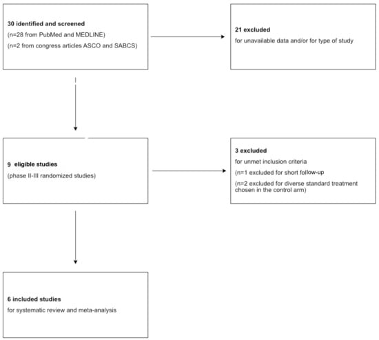 Overall, 30 studies were retrieved, of which 9 were eligible for this meta-analysis after excluding studies involving luminal and HER2+ BC subtypes and those without available data.