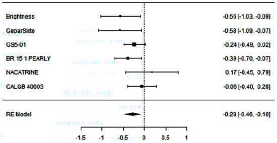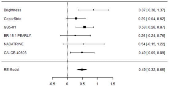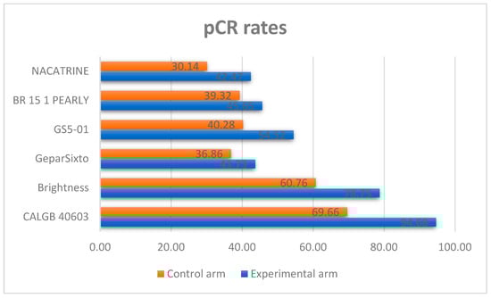 Of these 9, excluding studies with diverse standard-of-care (SoC) treatment chosen into the control arm and short follow-up (inferior to 4 years), six studies (BrighTNess [27], GeparSixto [28], GS5-01 [29], BR 15 1 PEARLY [30], NACATRINE [31], CALGB 40603 [32]) completely satisfied the inclusion criteria and were included in our investigation with a total of 3402 patients. Table 1 summarizes the main characteristics of each study included in the meta-analysis. Moreover, the pCR rates in the experimental and control arms of each study are shown in Figure 2.