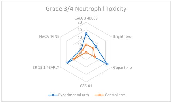 Neutrophil toxicity in grade 3–4 among carboplatin study arms and control groups.