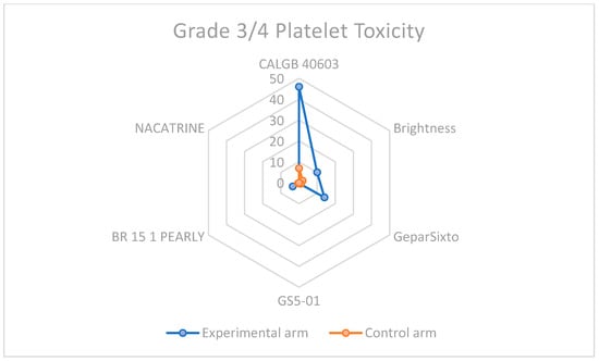 Grade 3–4 platelet toxicity in carboplatin-containing study arms and control arms.