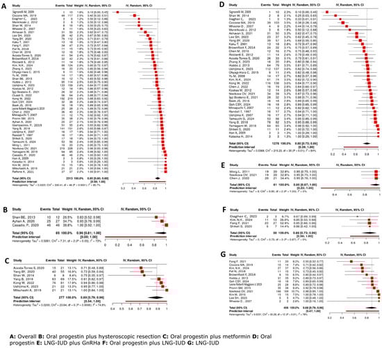 Seven studies [7,14,19,34,41,45,59] covering 277 patients assessed OPs plus metformin (Figure 2C), achieving a CR rate of 89% (95% CI: 79–96%). The combination of LNG-IUD and a GnRH analogue demonstrated a high CR rate of 95% (95% CI: 87–100%), with no observed heterogeneity (I2 = 0%) based on three studies [27,30,32] covering 61 patients. OP combined with LNG-IUD yielded a CR rate of 86% (95% CI: 73–96%) from four studies [25,26,29,47] including 100 patients with no heterogeneity detected (I2 = 0%) (Figure 2).