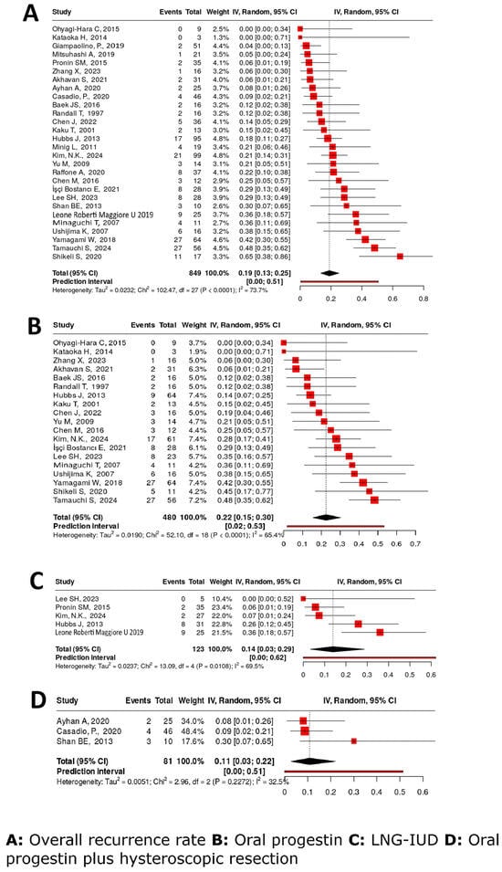 Twenty-eight studies [16,17,18,21,22,23,24,25,26,27,28,31,32,33,34,36,37,38,39,40,42,43,44,52,53,56,57,58] assessed RR, yielding a pooled RR of 19% (95% CI: 13–25%), with substantial heterogeneity (I2 = 73.7%). OP monotherapy, evaluated in 19 studies [16,17,21,24,25,26,27,28,31,33,38,39,42,43,44,53,56,57,58], was associated with a higher RR of 22% (95% CI: 15–30%) (I2 = 65.4%). OPs combined with HR [18,23,36] demonstrated a significantly lower RR of 11% (95% CI: 3–22%), with minimal heterogeneity (I2 = 32.5%). The recurrence rate of LNG-IUD [22,39,40,43] was 14% (95% CI: 3–29%), with substantial heterogeneity (I2 = 69.5%) (Figure 3).
