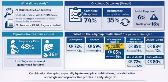- Keszthelyi, M.; Sebok, P.; Vida, B.; Szabó, V.; Kalas, N.; Várbíró, S.; Lőczi, L.; Ács, N.; Merkely, P.; Tóth, R.; et al. Efficacy of Fertility-Sparing Treatments for Early-Stage Endometrial Cancer—Oncologic and Reproductive Outcomes: Protocol of a Systematic Review and Meta-Analysis. Life 2025, 15, 1133. [Google Scholar] [CrossRef]