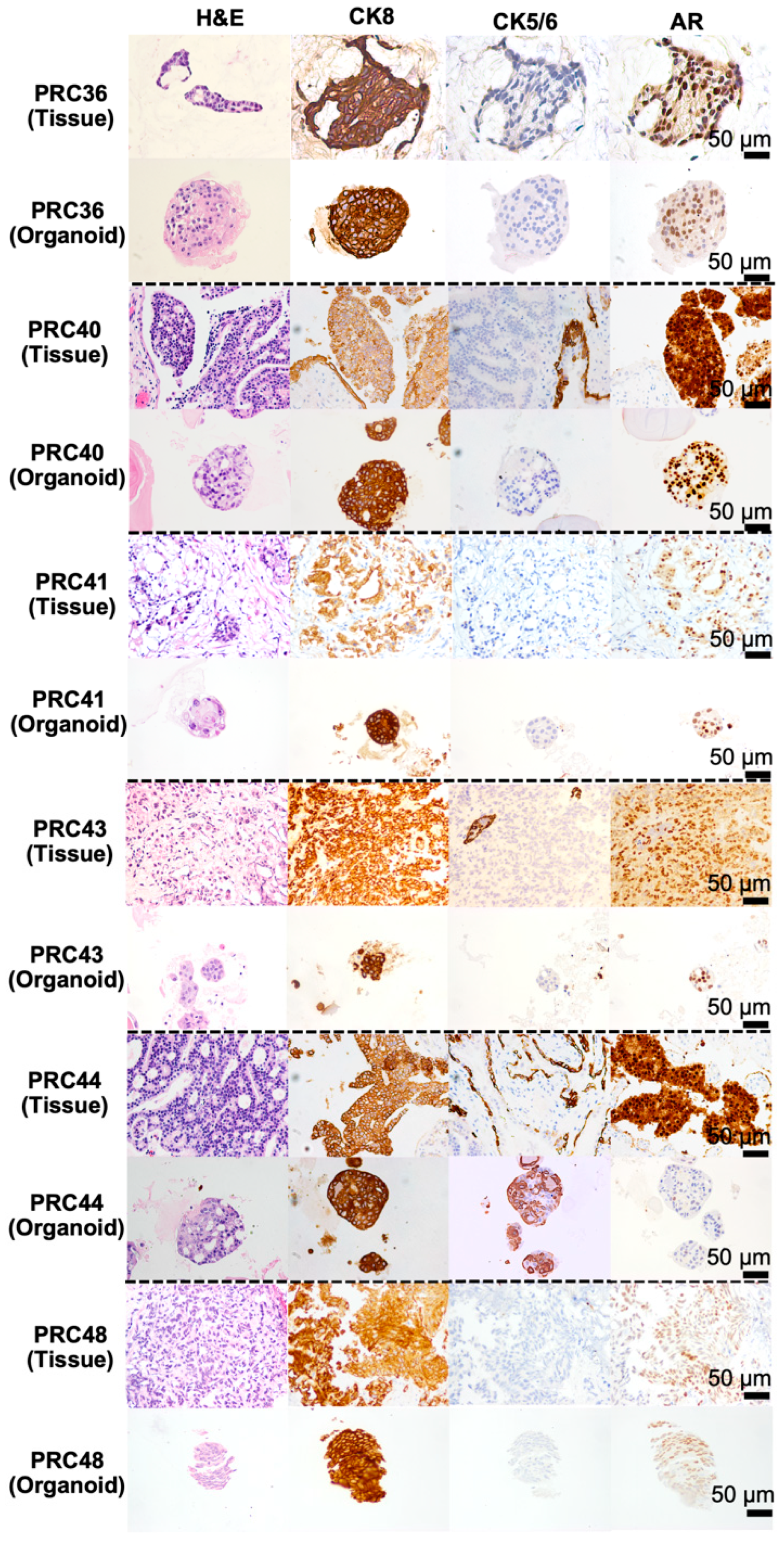 3.2. Validation of Advanced Prostate Cancer Organoids Compared with Original Tumors