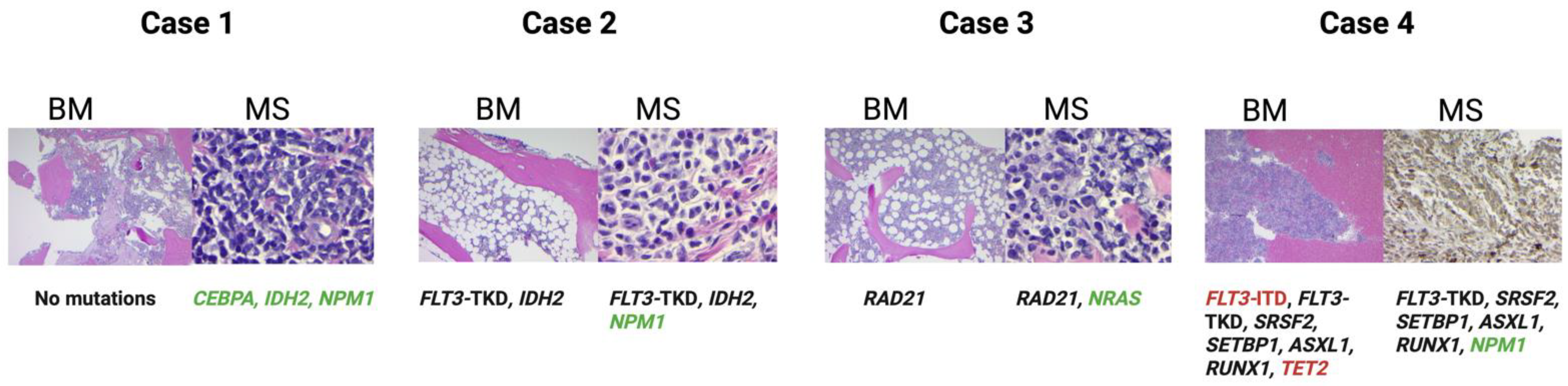 - Greenland, N.Y.; Van Ziffle, J.A.; Liu, Y.C.; Qi, Z.; Prakash, S.; Wang, L. Genomic analysis in myeloid sarcoma and comparison with paired acute myeloid leukemia. Hum. Pathol. 2021, 108, 76–83. [Google Scholar] [CrossRef]