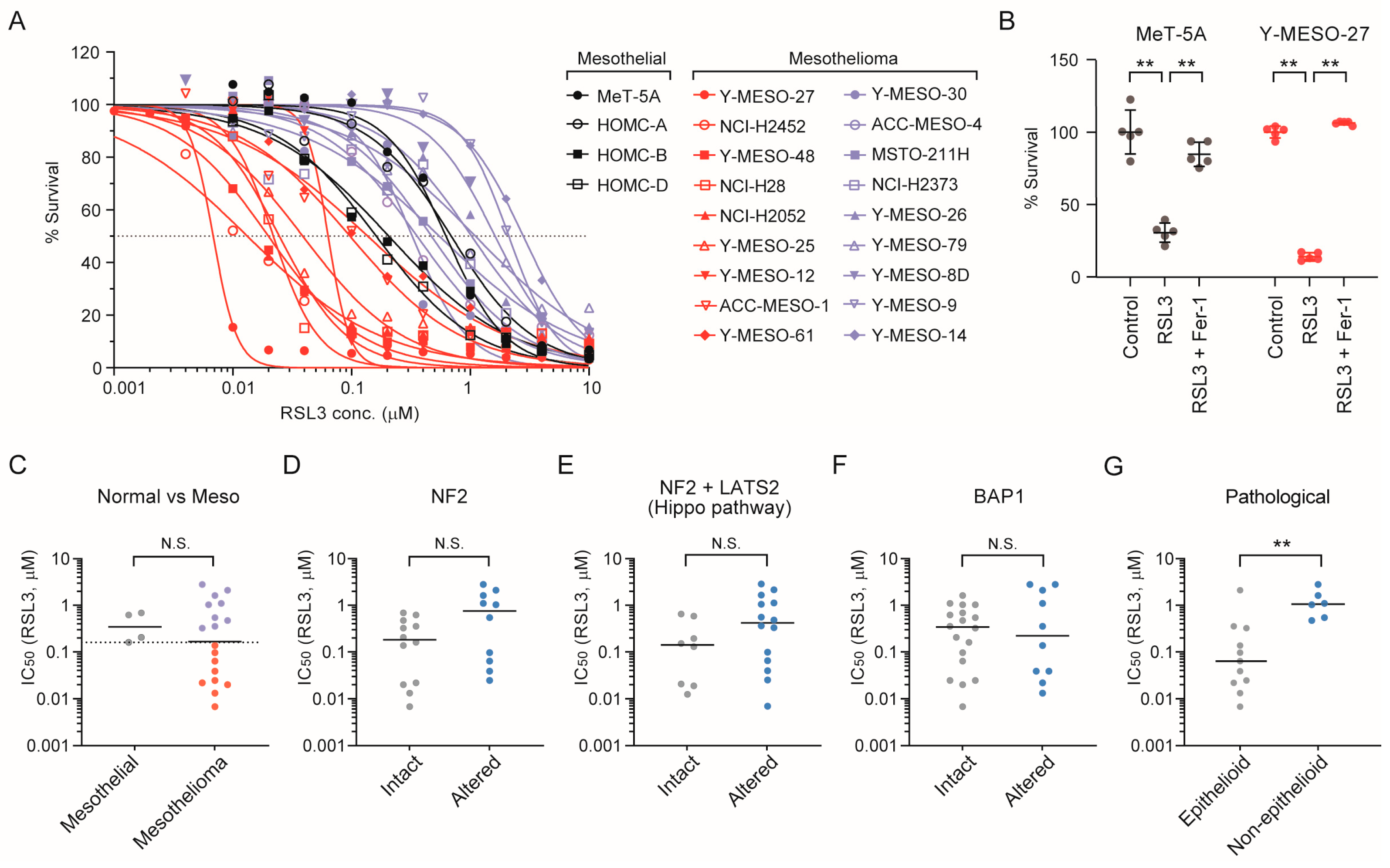 Chicago/Turabian StyleSato, Tatsuhiro, Ikue Hasegawa, Haruna Ikeda, Taichi Ohshiro, Lisa Kondo-Ida, Satomi Mukai, Satoshi Ohte, Tohru Maeda, and Yoshitaka Sekido. 2025. "Epithelioid Mesothelioma Cells Exhibit Increased Ferroptosis Sensitivity Compared to Non-Epithelioid Mesothelioma Cells" Cancers 17, no. 24: 3983. https://doi.org/10.3390/cancers17243983