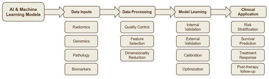 - AI in Risk Prediction and Prognosis, comprising studies that used survival analysis frameworks, multimodal data integration, and radiomics features to create or test predictive models.