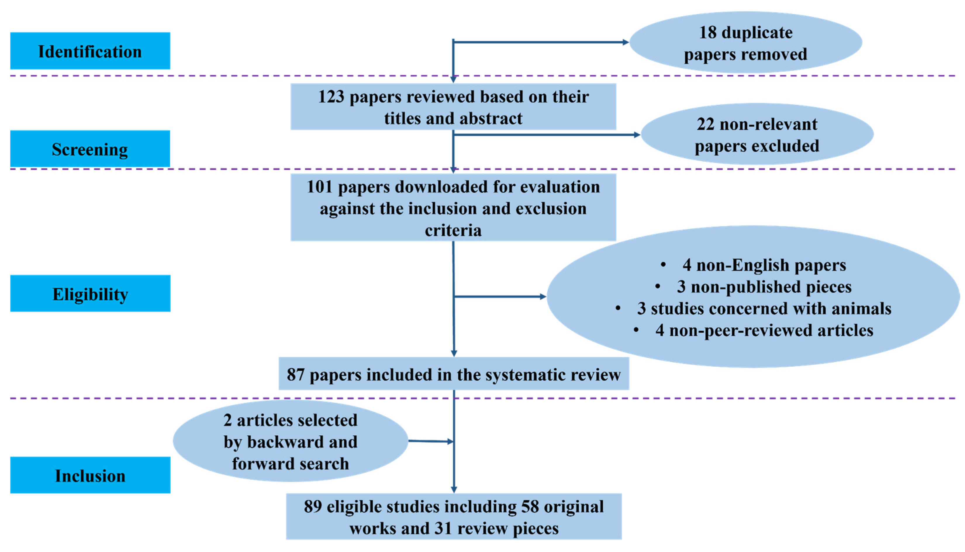 Four non-English publications, three unpublished works, three animal-based research, and four non-peer-reviewed articles were among the fourteen studies that were eliminated during this phase. In the end, 87 studies were included in the systematic synthesis after meeting all inclusion requirements. Backward and forward reference searching turned up two more papers, bringing the total number of qualifying studies to 89, which included 31 review papers and 58 original research articles. To guarantee openness and repeatability in the identification and selection of studies, the selection procedure, as shown in Figure 1, followed PRISMA-style guidelines.
