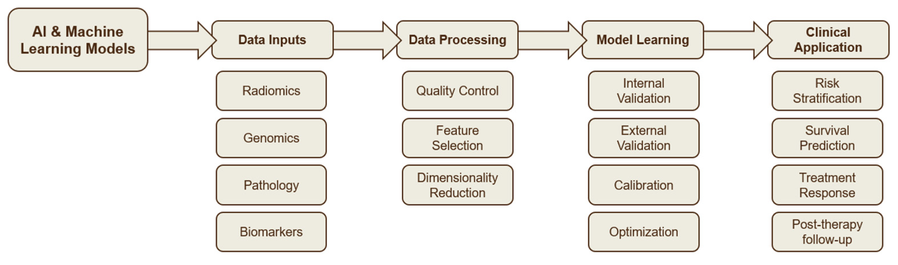 • AI in Risk Prediction and Prognosis, comprising studies that used survival analysis frameworks, multimodal data integration, and radiomics features to create or test predictive models.