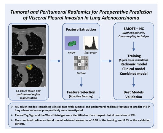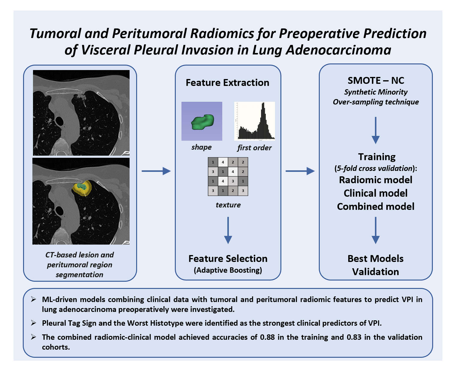 In the present study, we aim to develop and validate machine learning (ML)-based classification models that integrate clinical variables with tumoral and peritumoral radiomic features to predict VPI in patients with lung adenocarcinoma preoperatively.