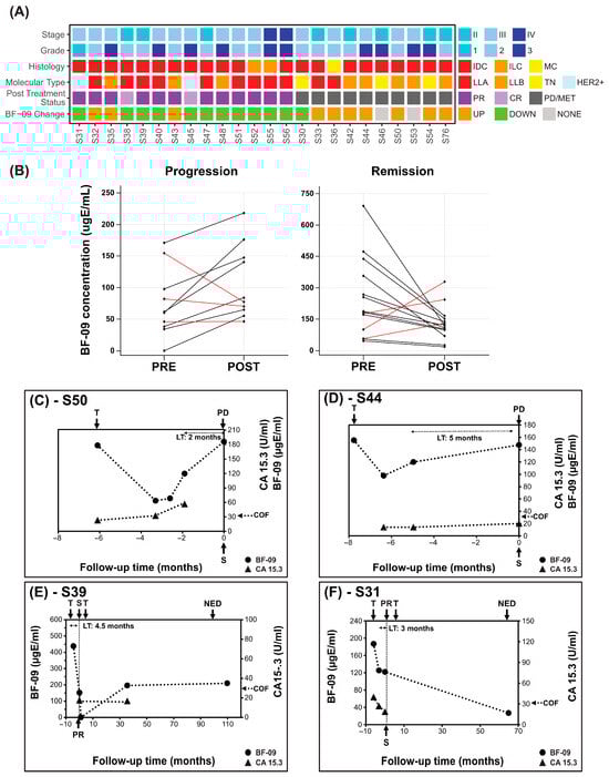 Dynamics of BF-09 and CA 15-3 during treatment follow-up are shown for representative cases in Figure 1C–F. Additional treatment and clinicopathological details are shown in Table S5.