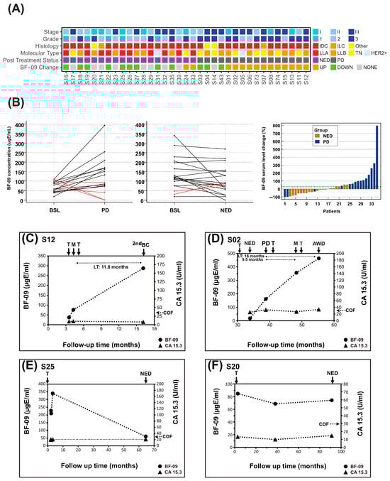 We showed previously that BF-09 serum levels were higher in the presence of BC and progressive disease, so elevated baselines in some patients (Figure 2B, center) could have been due to residual disease not detected by clinical imaging at the time [30,54,55,56]. Those whose high baselines remained unchanged even at long-term NED (Figure 2B, center) could also be explained by physiological reactions to therapy [57,58,59,60].